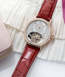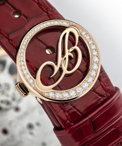The 35 mm rose gold casing encircles a dial that is embellished with 281 diamonds. These diamonds create graceful arcs between the 3 and 9 o’clock positions, and those within the chapter ring employ the snow-setting technique for placement.