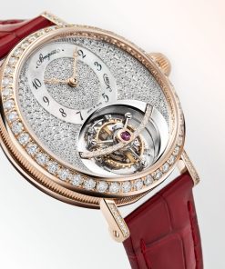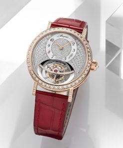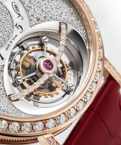 The tourbillon’s intricate workings are highlighted by components that present a play of grey and pink hues for contrast. In addition, both the bezel and lugs are adorned with diamonds, as is the crown, which is topped with a rose-cut diamond.