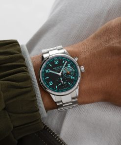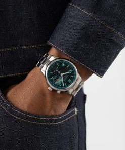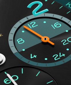 The dials are where the magic happens. Black galvanized with a sunburst finish, they shimmer beneath blue anti-reflective sapphire, accented by luminous flashes of turquoise, orange, or green. Each colorway channels the sensation of navigating cities from above at night or reading cockpit instruments mid-flight. Whether it’s the turquoise “Trace,” the amber-orange “Grid” echoing the glow of urban streetlights, or the olive-and-ecru “Vector,” every variant captures a distinct facet of nocturnal travel.