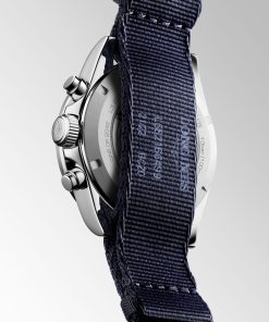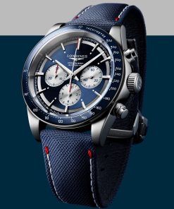Equipped with the Longines L898.5 calibre and silicon balance-spring, the watch offers exceptional magnetic resistance and precision, with a 59-hour power reserve. It has a 42 mm case, water-resistant up to 100 meters, and a tachymetric bezel with a blue ceramic insert. The sunray blue dial features a contrasting sub-second dial, silver counters, and a special snailed finish under applied indexes.