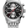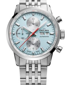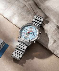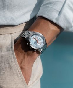 The Continental stands out with its polished and brushed 42 mm stainless steel case, paired with a sleek seven-link bracelet that wears comfortably all day. The dial comes in classic black or silver, or in lighter seasonal tones like blue and salmon, each with a sunray finish and detailed guilloche counters. At 3 o’clock, a day-date window keeps things balanced and useful, while the red chronograph hand and tachymeter scale give it a sportier edge. Luminous hands and markers ensure it’s just as practical at night as it is during the day.