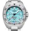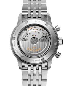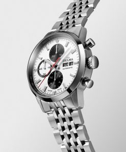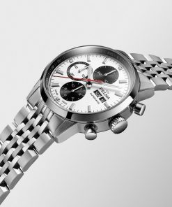 The Continental stands out with its polished and brushed 42 mm stainless steel case, paired with a sleek seven-link bracelet that wears comfortably all day. The dial comes in classic black or silver, or in lighter seasonal tones like blue and salmon, each with a sunray finish and detailed guilloche counters. At 3 o’clock, a day-date window keeps things balanced and useful, while the red chronograph hand and tachymeter scale give it a sportier edge. Luminous hands and markers ensure it’s just as practical at night as it is during the day.