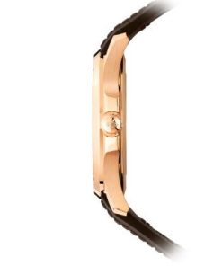 40mm 18K rose gold case, sapphire crystal back, embossed chocolate brown dial, self-winding caliber 324 SC movement with date, approximately 45 hours of power reserve, chocolate brown composite strap with fold-over buckle. Water-resistant up to 120 meters.