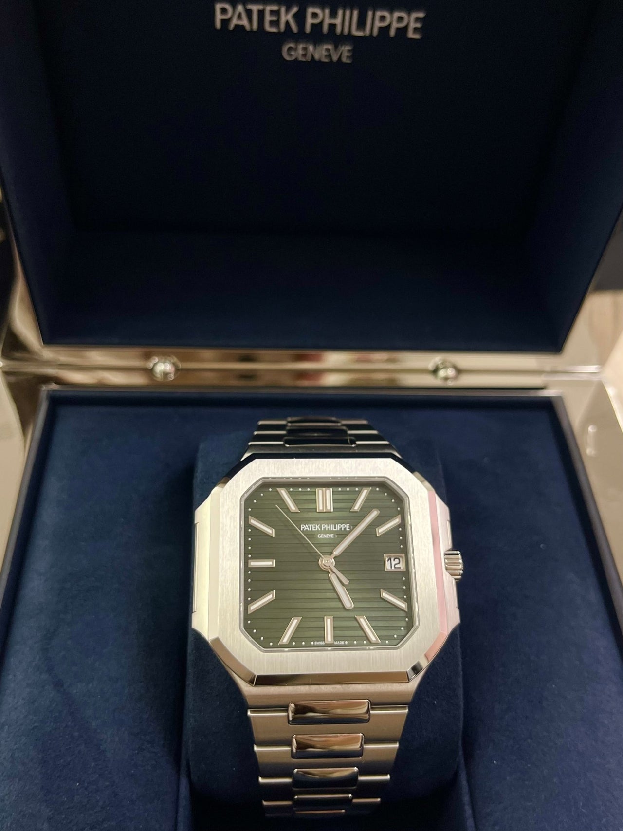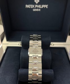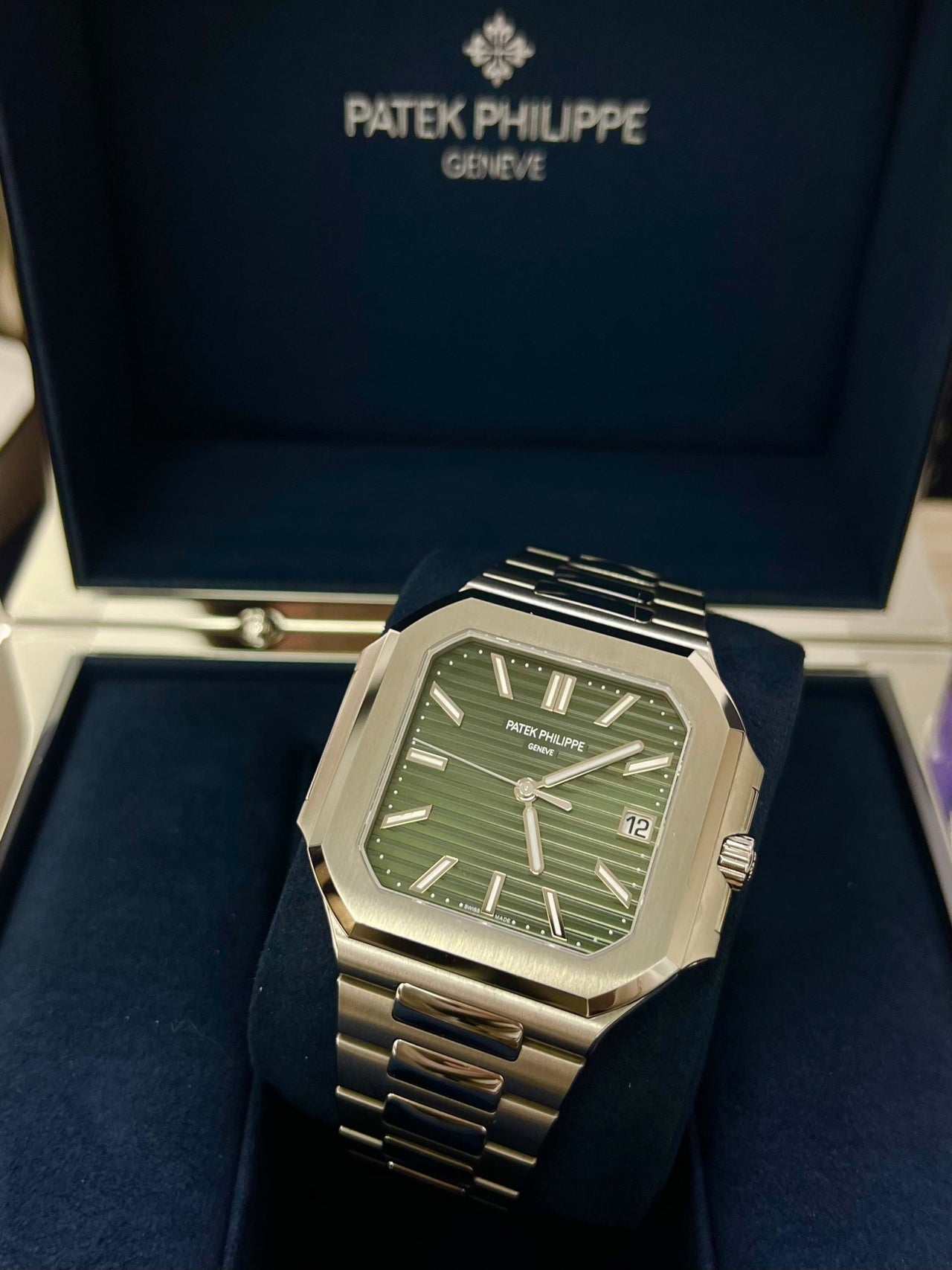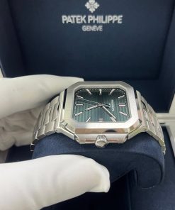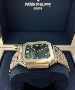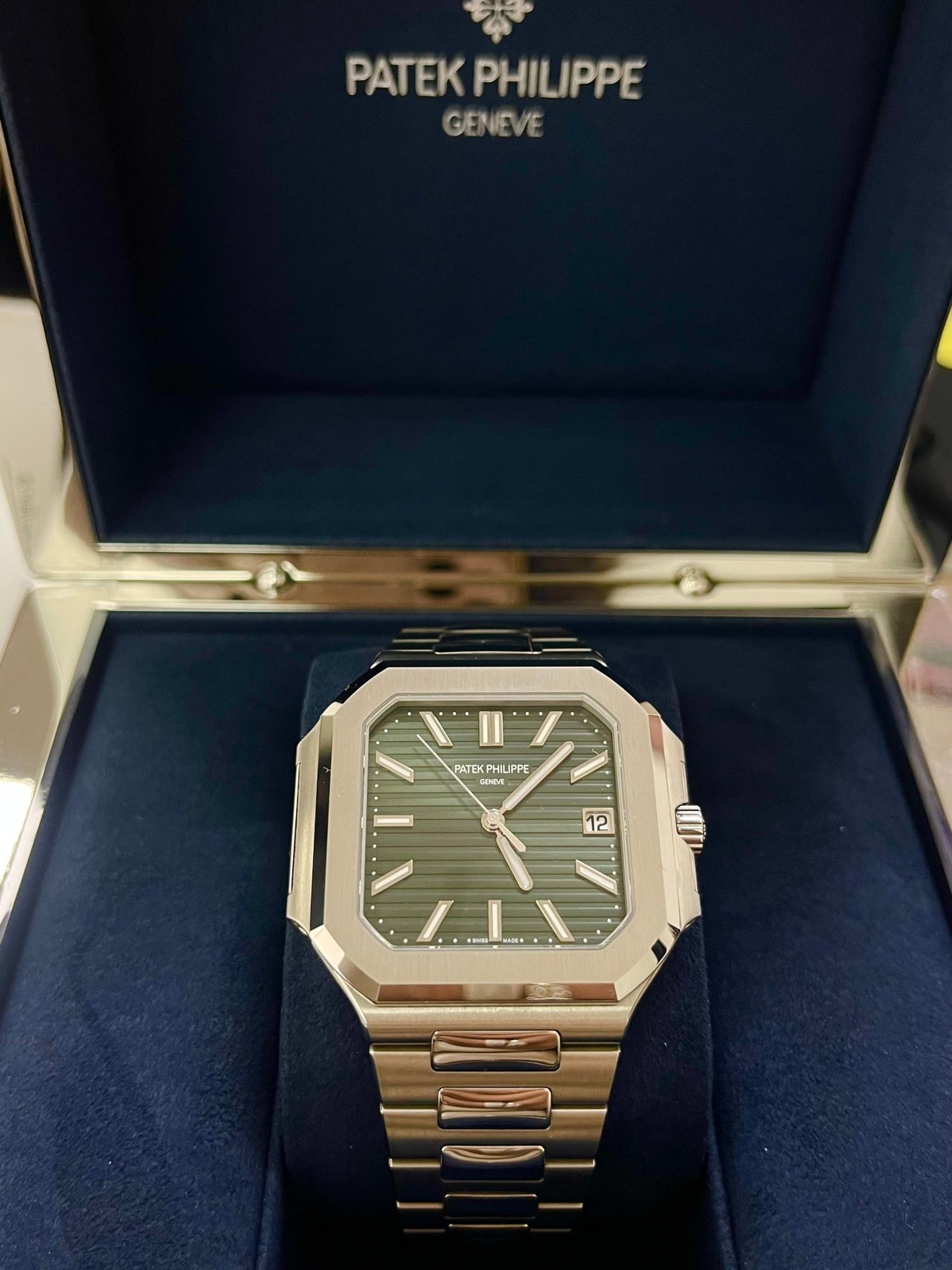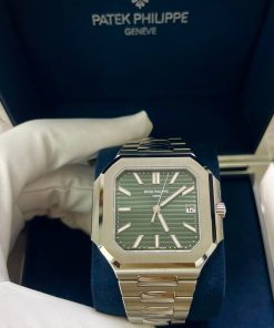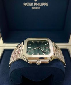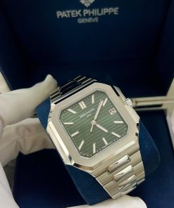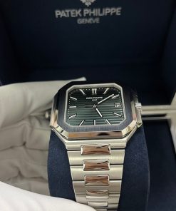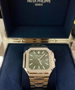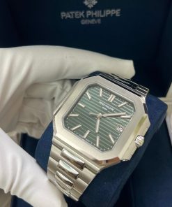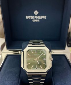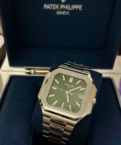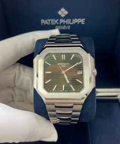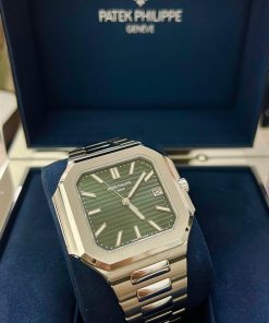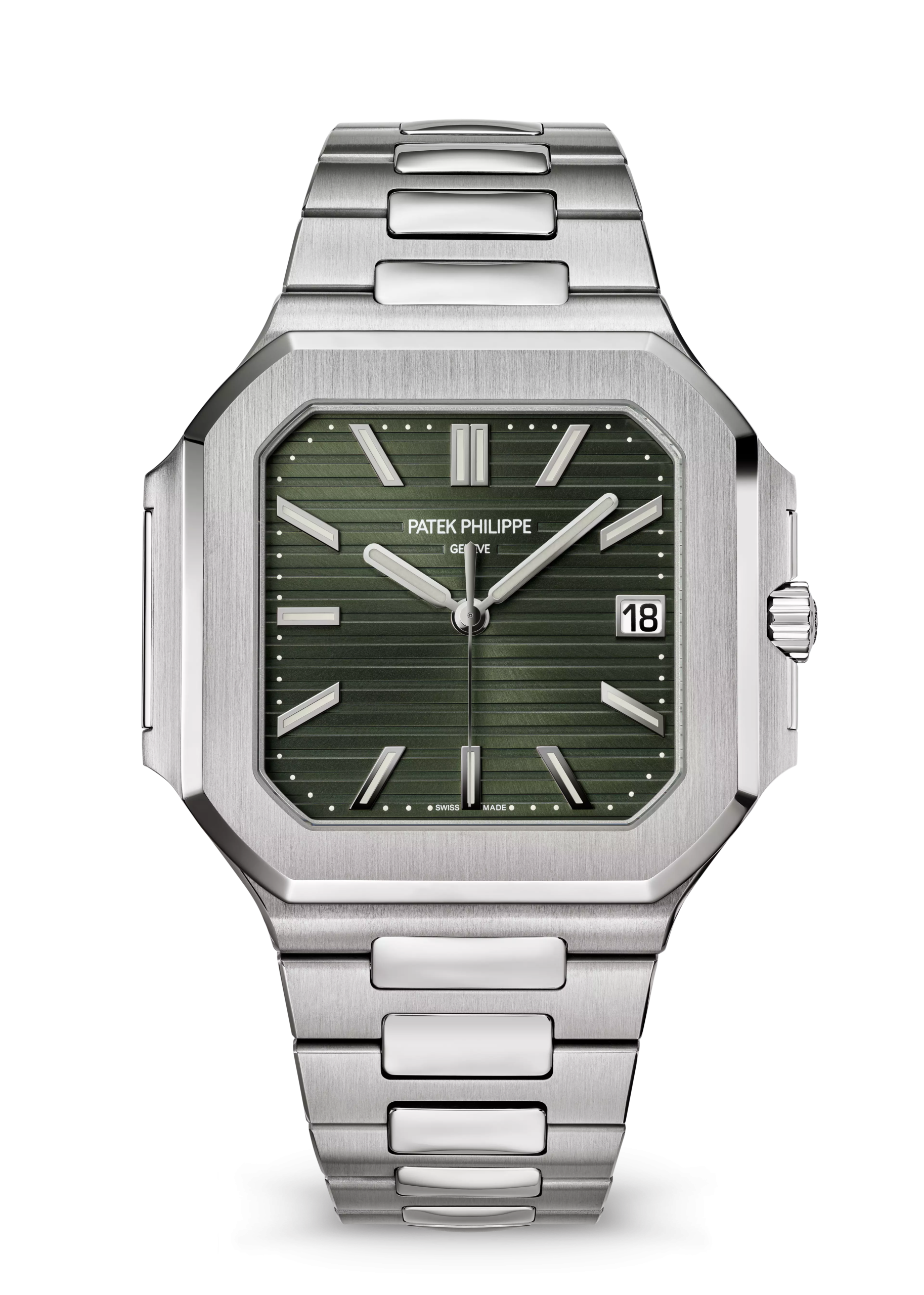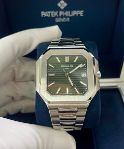 The new square case with its rounded edges is distinguished by its elegantly slim fit on the wrist. The horizontally embossed dial features an elegant sunburst olive green color. The steel bracelet is equipped with a lockable adjustment system and a patented Patek Philippe fold-over clasp ensuring both comfort and security.