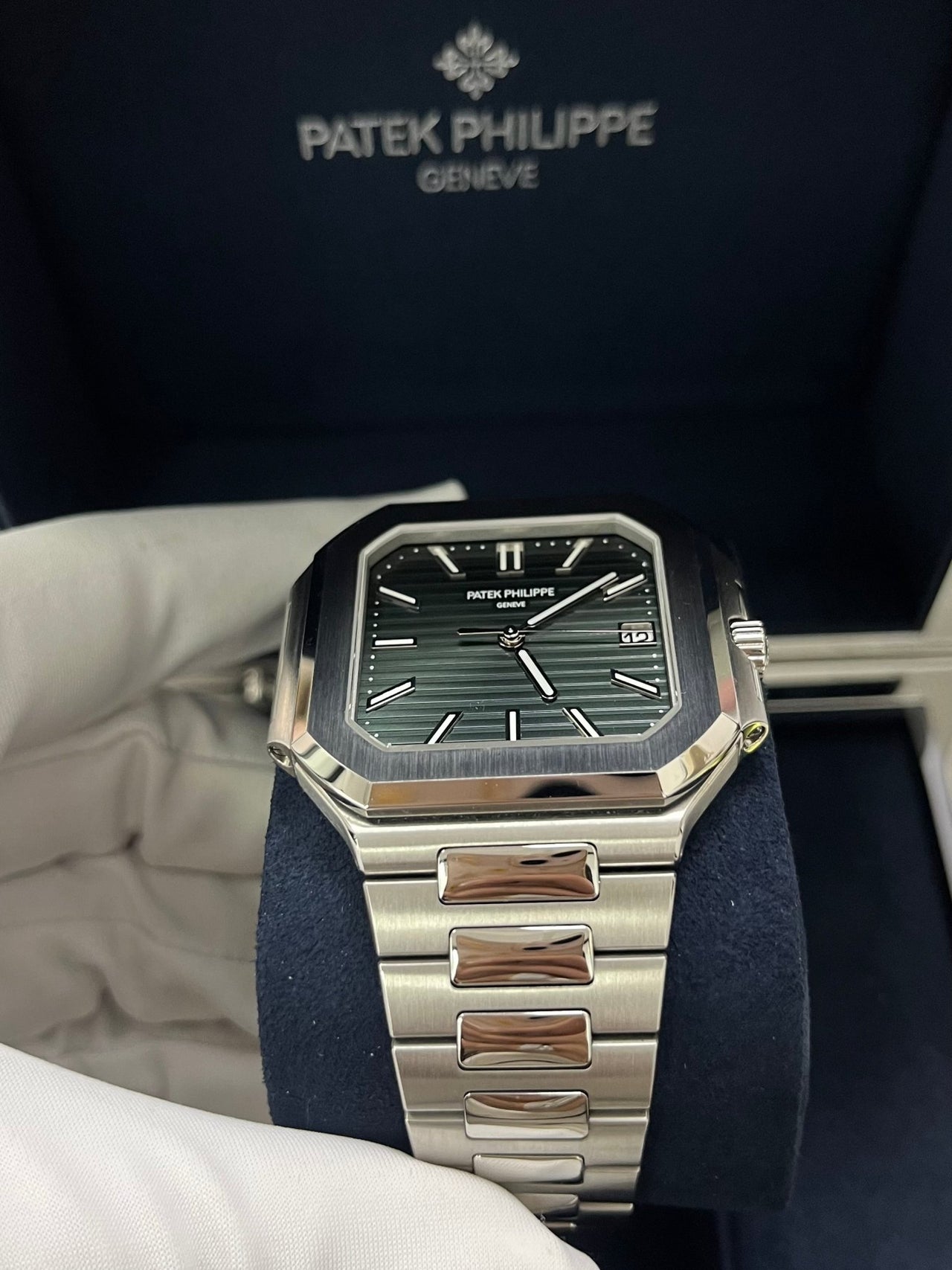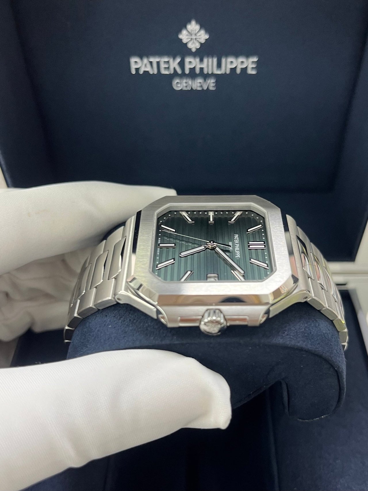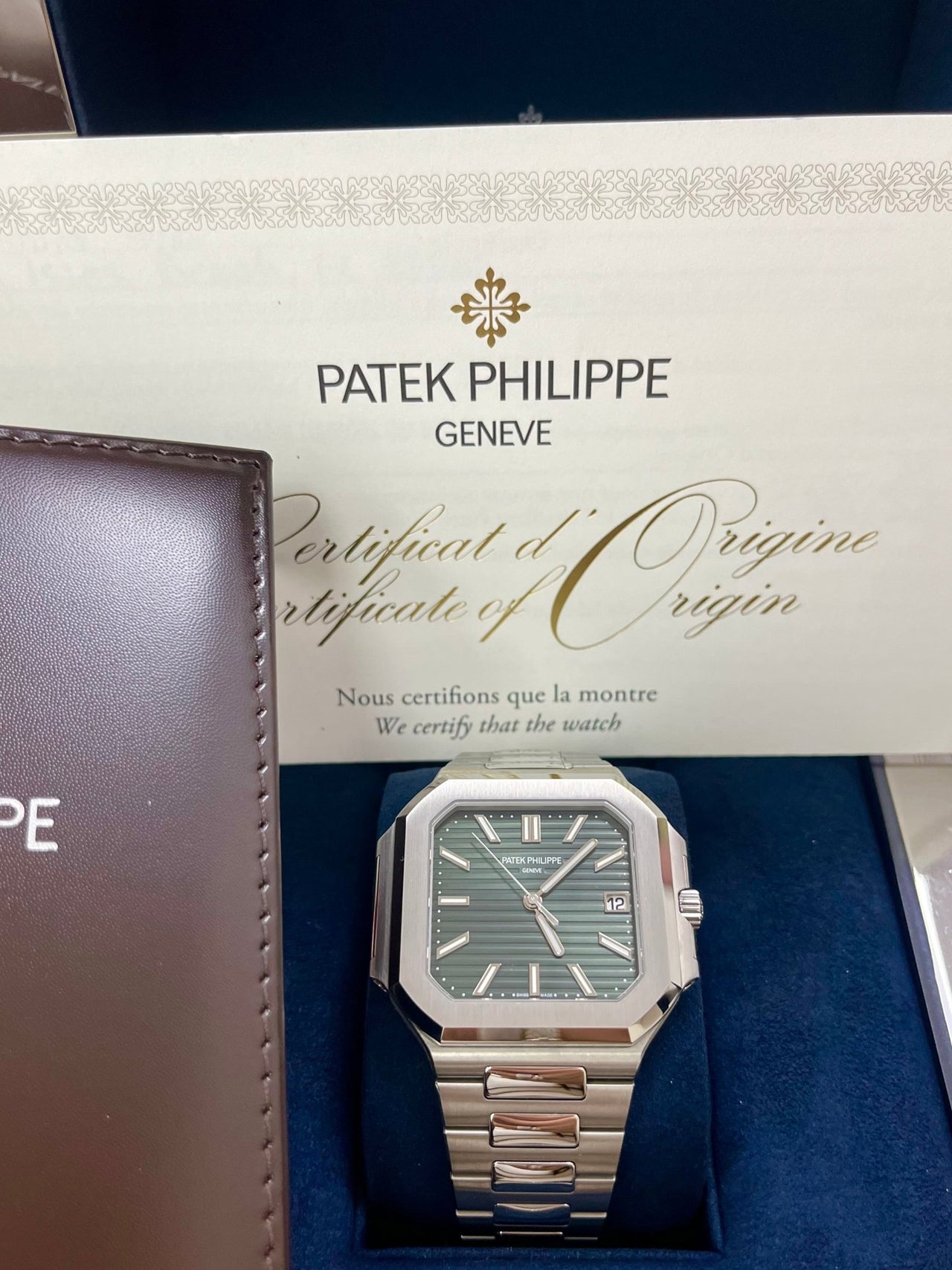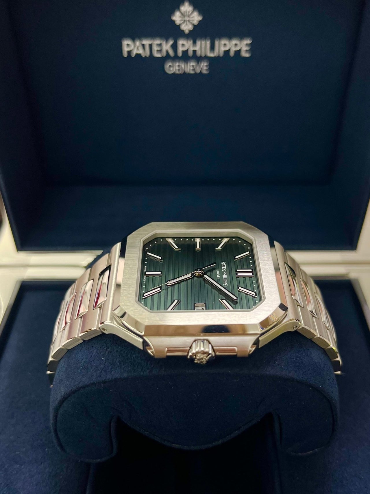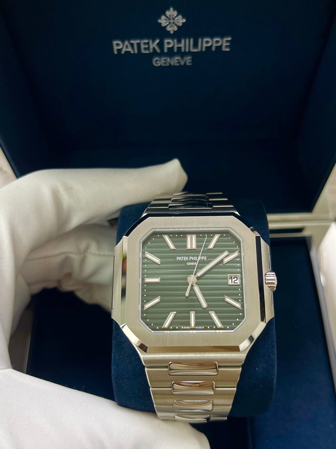 The new square case with its rounded edges is distinguished by its elegantly slim fit on the wrist. The horizontally embossed dial features an elegant sunburst olive green color. The steel bracelet is equipped with a lockable adjustment system and a patented Patek Philippe fold-over clasp ensuring both comfort and security.