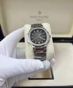 The Ladies Automatic Nautilus in steel with diamond-set bezel asserts its presence on the wrist with a slightly larger diameter (35.2 mm instead of 33.6 mm). Patek Philippe has also revised its range of dial colors, introducing blue opaline, silvery opaline or gray opaline, grading to black at the periphery.