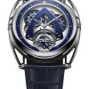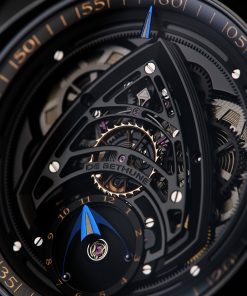 The contemporary face of the watch is striking in its symmetry and spatial depth. A deltoid bridge anchors the balance wheel at 6 o’clock, while the polished, domed surfaces and satin finishes lend the black-coated movement a bold yet refined presence. Polished blued hands, a jumping seconds complication, and golden accents ensure legibility and allure in equal measure. This side speaks to a modern design, emphasizing clean geometry, precise mechanics, and dynamic contrasts—hallmarks of De Bethune’s forward-thinking design language.