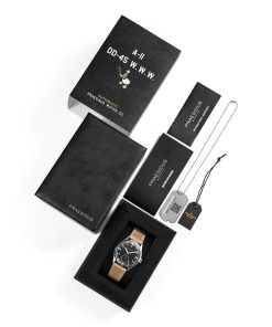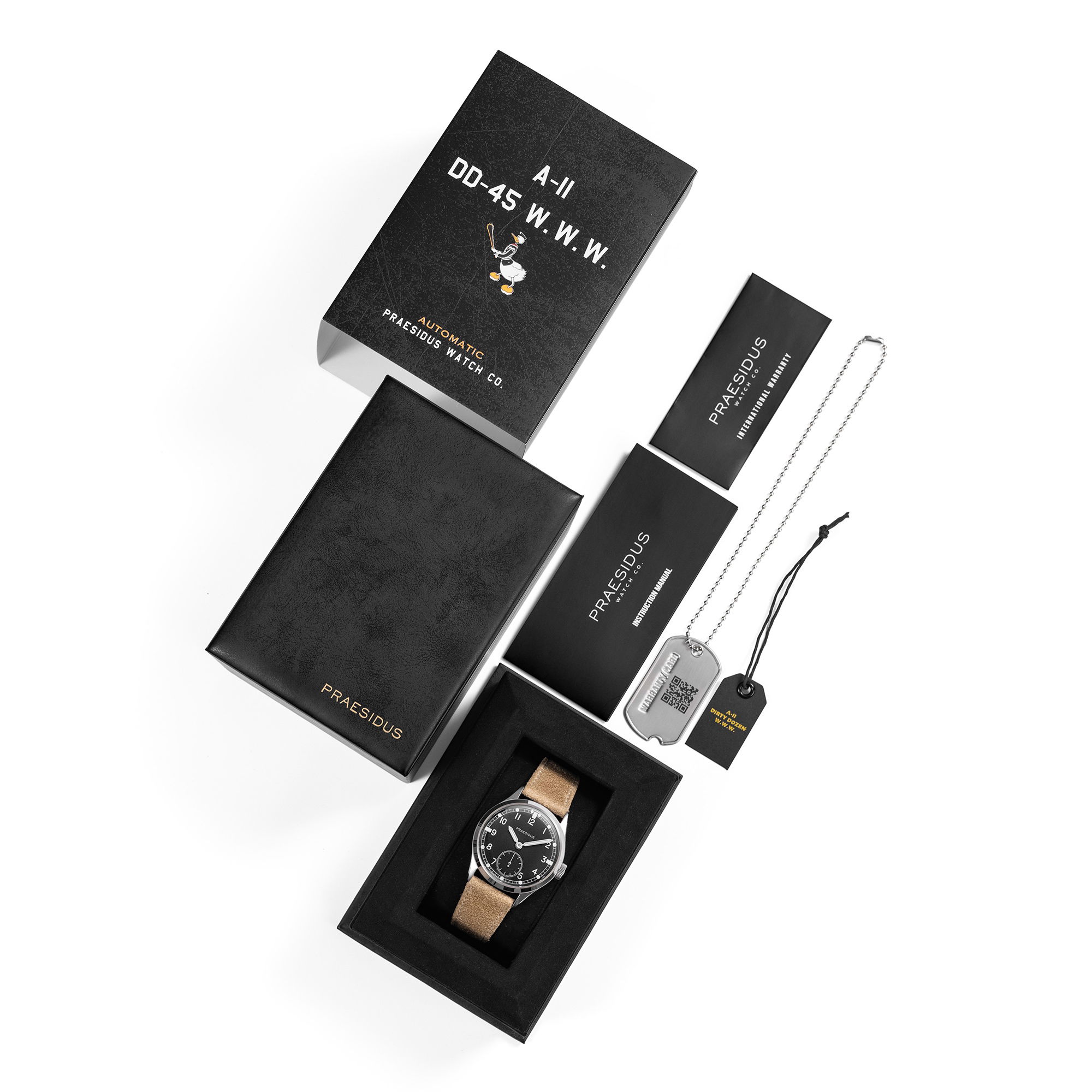 The DD-45 “Factory Fresh” is a modern interpretation of what a Dirty Dozen watch would have looked like fresh off the production line of any of the twelve manufacturers in 1944-45. It features crisp white Super Luminova indexes and hands paired with a textured black dial, providing the same high legibility as the originals did when they were first delivered from Switzerland during World War II.
