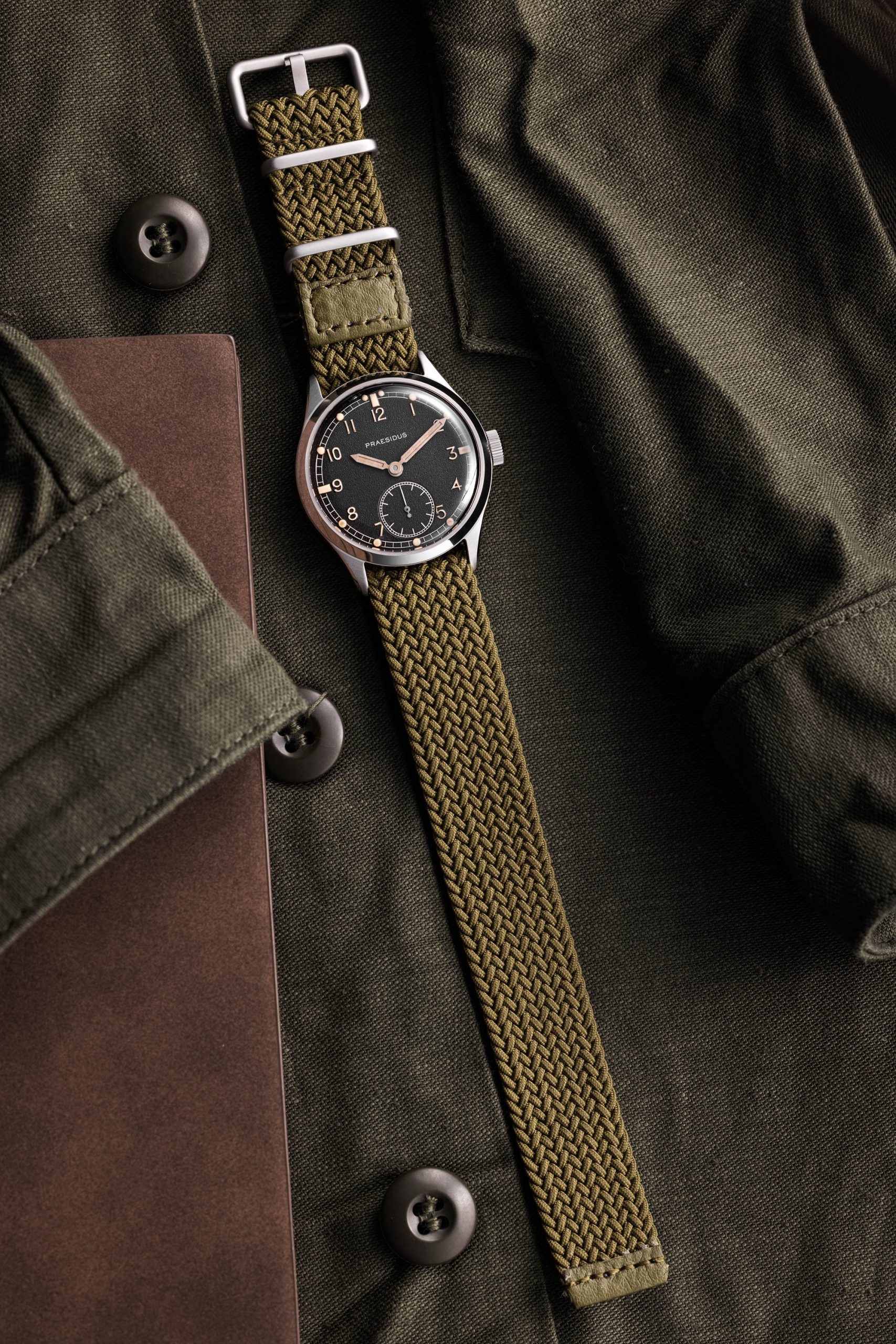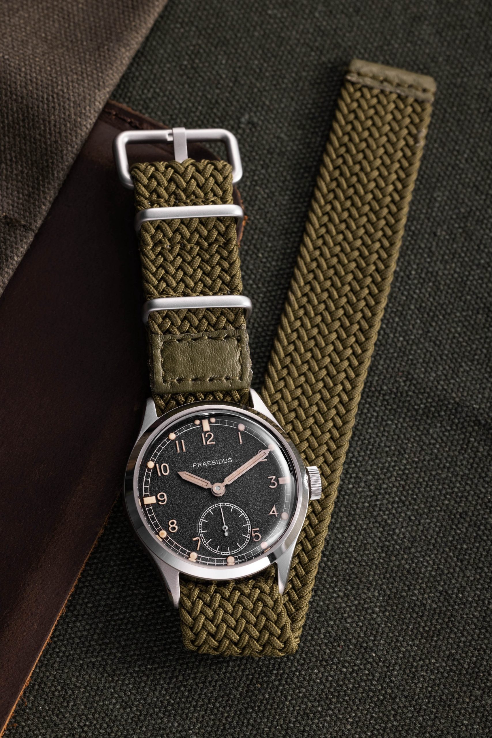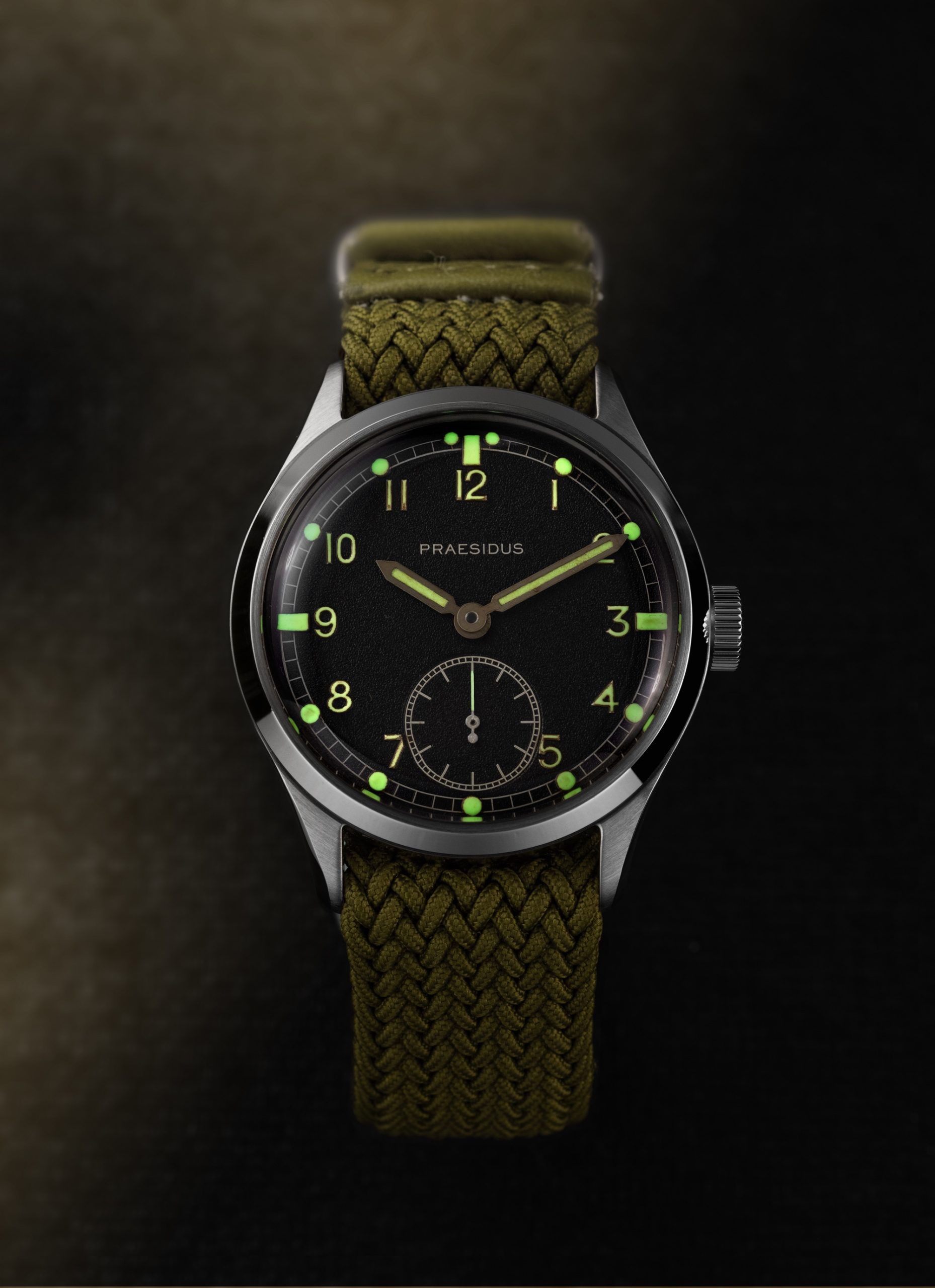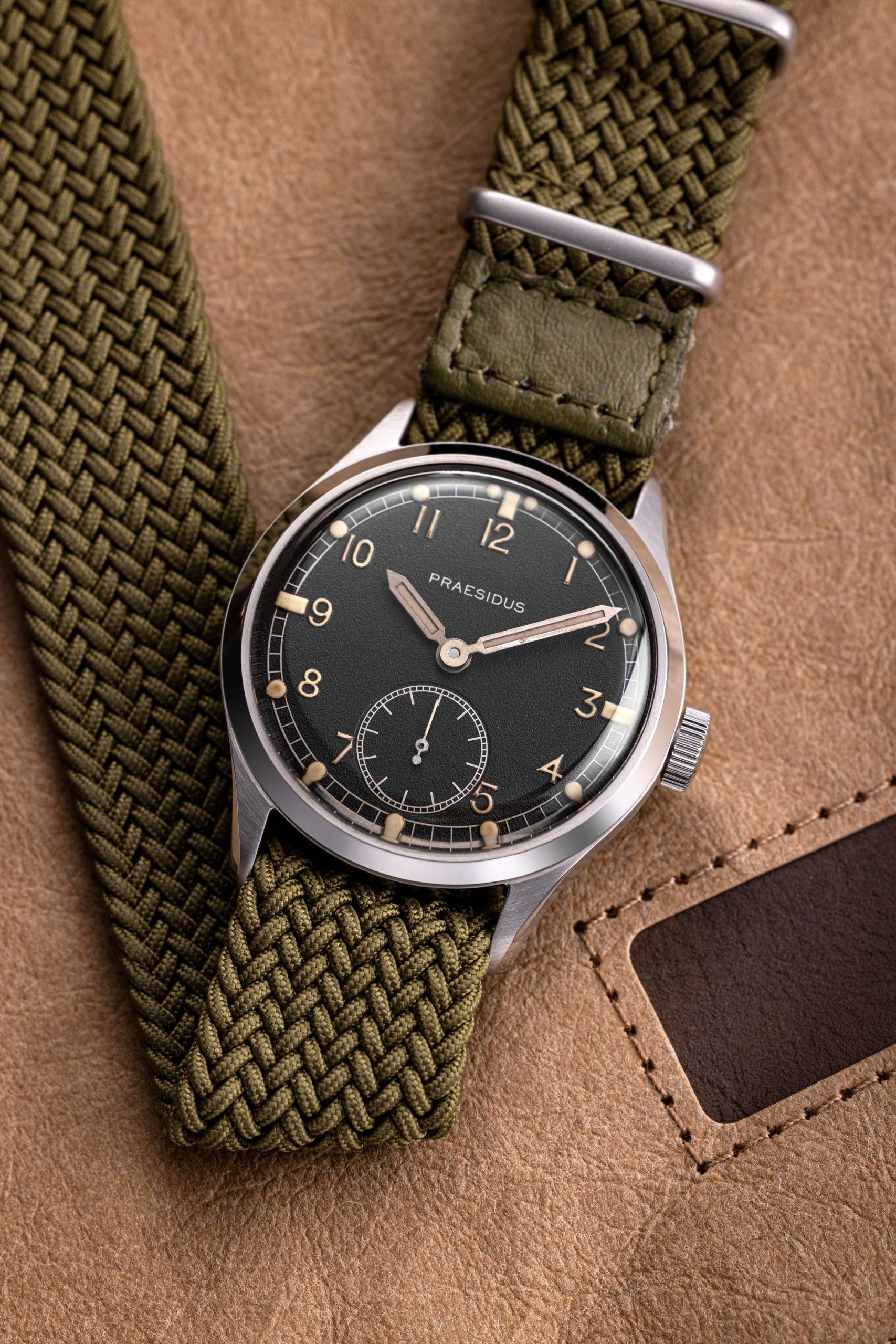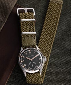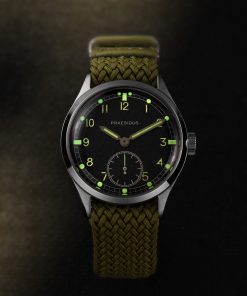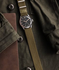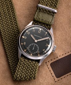 The DD-45 is not just a visual tribute but also a modern one to the original Dirty Dozen watches, which were designed for the British War Office to standardize high-performance field watches for the British Army. The DD-45 surpasses the original specifications, bringing the design into the 21st century. Originally intended to be “Waterproof,” the DD-45 now has 10ATM water resistance and a screw-down crown, ensuring durability and safety in wet conditions. Additionally, the double-domed sapphire crystal provides best-in-class scratch resistance.