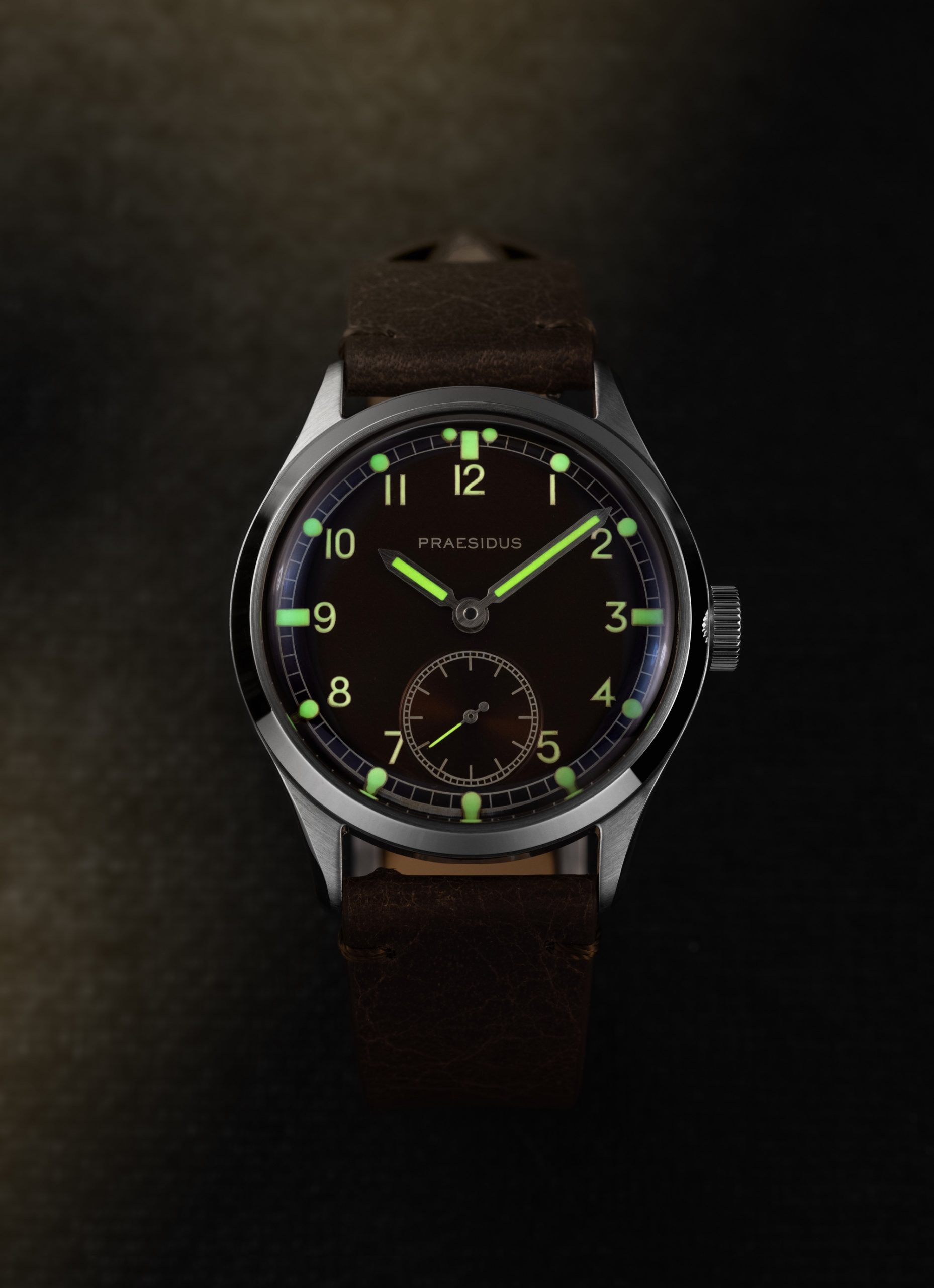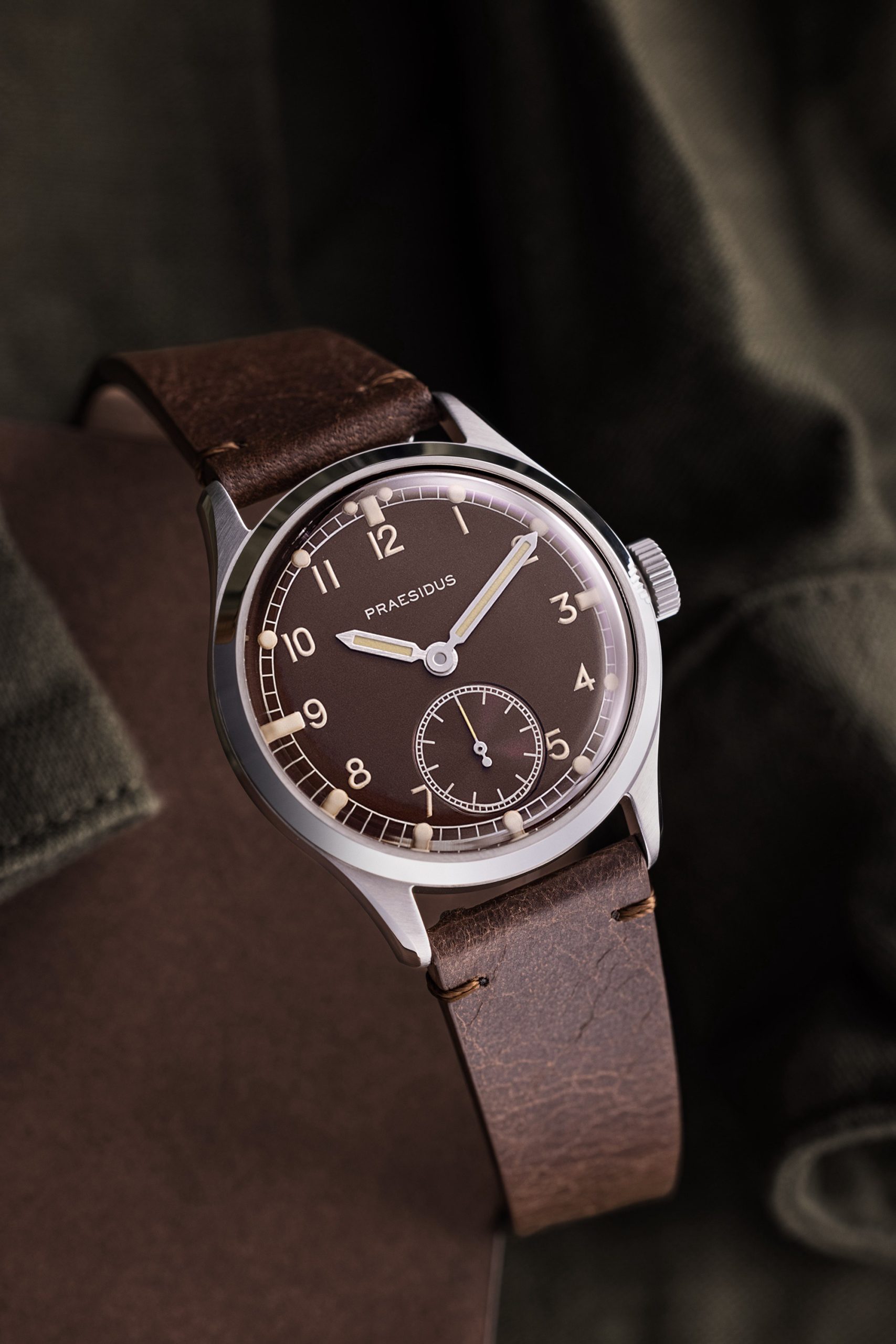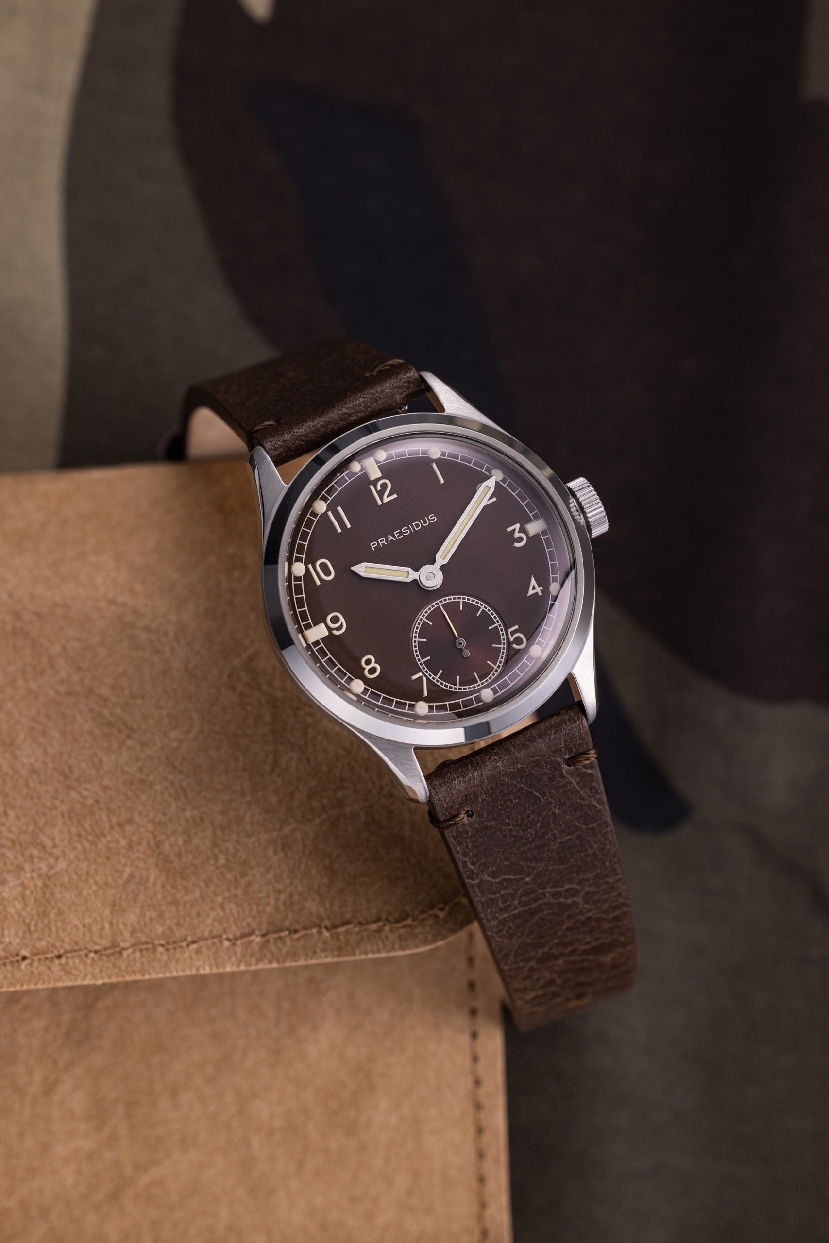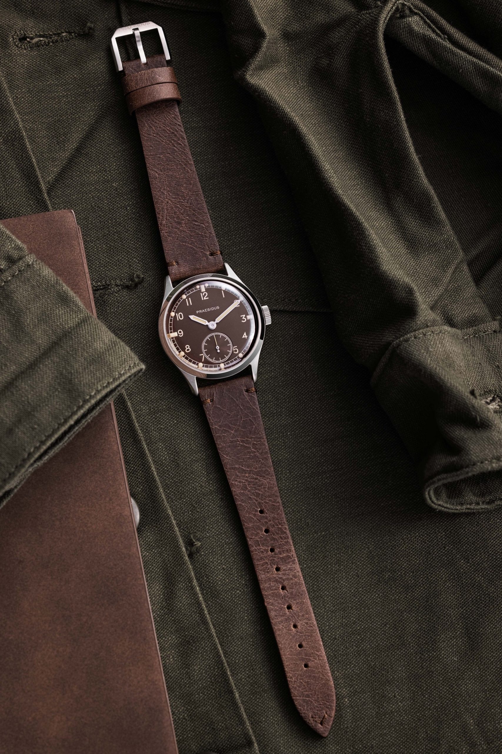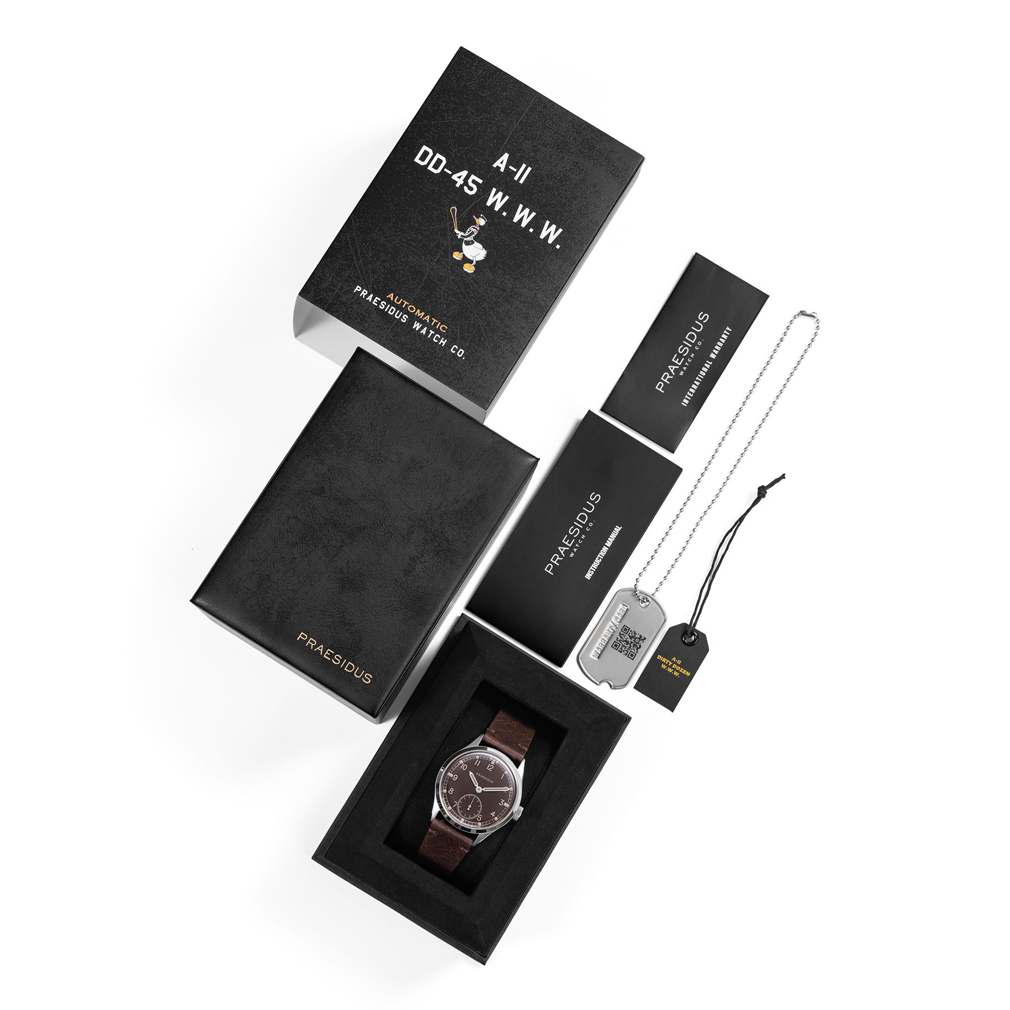 The DD-45 “Tropical” is the result of two years of development with a dial supplier. This watch features a deep brown dial and patina indexes and hands, designed to mimic a rare aging process. Over the years, exposure to sun and humidity causes black dial paint to transform into a dark brown. This unique “tropicalization” effect on the DD-45 creates a distinct and vintage look, reminiscent of some rare Dirty Dozen watches seen today, 80 years after their initial production.