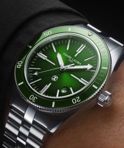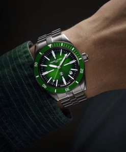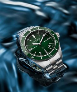 The dial features an ingenious two-layer sandwich construction, where perforated hour markers reveal a Super-LumiNova-coated base, ensuring exceptional visibility in low-light conditions. The luminous hands and 12 o’clock marker on the bezel further enhance underwater legibility. A gradient black, blue, or green dial adds a sophisticated depth, complemented by a discreet round date aperture between 4 and 5 o’clock for a clean, uncluttered design. The ceramic bezel, featuring a luminous pip at noon and countdown markers, balances functional precision with a refined color palette that seamlessly integrates with the dial.