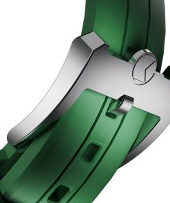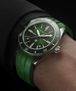 The dial features an ingenious two-layer sandwich construction, where perforated hour markers reveal a Super-LumiNova-coated base, ensuring exceptional visibility in low-light conditions. The luminous hands and 12 o’clock marker on the bezel further enhance underwater legibility. A gradient black, blue, or green dial adds a sophisticated depth, complemented by a discreet round date aperture between 4 and 5 o’clock for a clean, uncluttered design. The ceramic bezel, featuring a luminous pip at noon and countdown markers, balances functional precision with a refined color palette that seamlessly integrates with the dial.