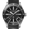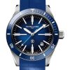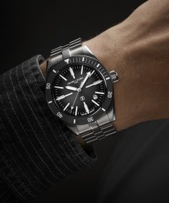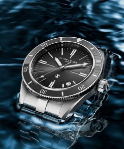 The dial features an ingenious two-layer sandwich construction, where perforated hour markers reveal a Super-LumiNova-coated base, ensuring exceptional visibility in low-light conditions. The luminous hands and 12 o’clock marker on the bezel further enhance underwater legibility. A gradient black, blue, or green dial adds a sophisticated depth, complemented by a discreet round date aperture between 4 and 5 o’clock for a clean, uncluttered design. The ceramic bezel, featuring a luminous pip at noon and countdown markers, balances functional precision with a refined color palette that seamlessly integrates with the dial.