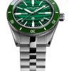 The Meteorite model brings Muonionalusta iron meteorite to the wrist, which is a material shaped over millions of years and revealed through precise slicing and acid treatment. Its sandwich dial, cut-out indexes, and glowing Super-Luminova base give the extraterrestrial texture room to breathe. The Malachite edition offers an earthbound contrast, each dial cut from vivid green malachite selected for stability and its naturally swirling bands, then polished with care to preserve the stone’s character.