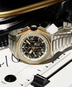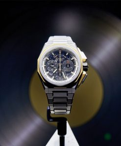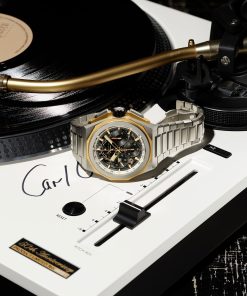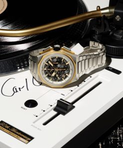 The DEFY Extreme Carl Cox is the second collaboration between ZENITH and the DJ, featuring a limited edition of 100 pieces. The watch draws inspiration from Carl Cox’s turntables, with a matte-finished stainless steel and yellow gold case, giving it a retro-futuristic look. The open dial resembles vinyl records, and the watch houses the El Primero 9004 calibre, the world’s fastest serially produced chronograph movement.