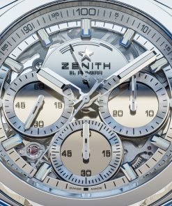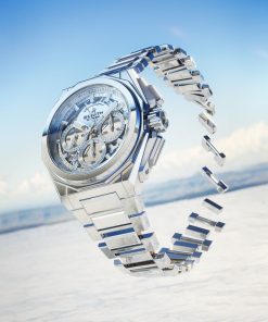 Visible through the open dial and case back, the El Primero caliber operates with two independent escapements, pulsating at rates of 5Hz for timekeeping and 50Hz for the chronograph function, setting a new standard for precision.