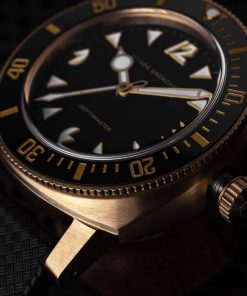 The Depthmaster ‘Pac-Man’ in Bronze retains the original’s 38mm cushion case, robust lugs, and thick metal bezel with a knurled edge. The black ceramic bezel insert offers a striking contrast to the bronze case, making the ‘Pac-Man’ numerals stand out even more. With a variety of strap options, including ‘Tropic’ rubber, leather, and ‘Racing’ (seven choices in total), the Depthmaster Bronze is versatile and suitable for any occasion.