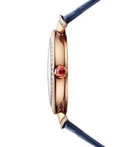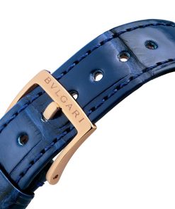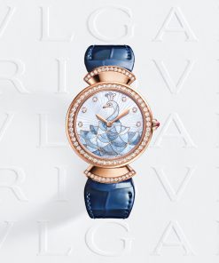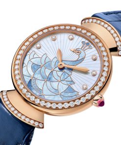 The Divas’ Dream Peacock Mother-of-Pearl Marquetry by Bulgari features a design of a peacock in gold and mother-of-pearl on its dial. The peacock’s fan-shaped feathers extend across the lower dial, with a tuft on its head and a rose gold beak. This is set against a white mother-of-pearl background, engraved with rays to emphasize the peacock’s representation of wealth, protection, and wisdom. The design evokes the image of a star-studded sky. The creation of this marquetry is highly intricate, owing to the delicate nature of mother-of-pearl. The elements are painted on the back to create various shades of blue, then precisely cut and fitted into recesses carved into the dial. Rose gold outlines enhance the natural iridescence of the mother-of-pearl, highlighting its organic beauty and preciousness.