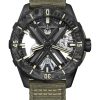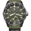 The Diver [NET OPS] is a high-performance and sustainable sports watch featuring the automatic manufacture calibre UN-118 with a 60-hour power reserve and silicon balance spring. It is water-resistant up to 300 meters and has an escapement coated in DiamonSil for precision and durability. The case is made from 95% recycled stainless steel, with parts constructed from Nylo® (60%) and Carbonium® (40%). Nylo® is made from upcycled fishing nets, while Carbonium® is an environmentally friendly carbon composite with a marbled effect. The khaki green dial includes a power reserve indicator and small seconds display, highlighted by Super-Luminova® markings. The watch comes with either a fabric strap made partly from upcycled fishing nets or a khaki green rubber strap with a black ceramic element.
