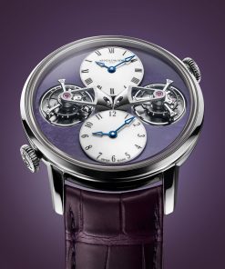 The Double Tourbillon White Gold, Charoite Edition by Arnold & Son is a striking blend of rare materials and advanced watchmaking. The dial is made from charoite, a unique stone with swirling shades of mauve and white, carefully cut and polished to reveal its intricate texture. This is complemented by a white gold case and opal subdials, creating an elegant and refined Haute Horlogerie watch.