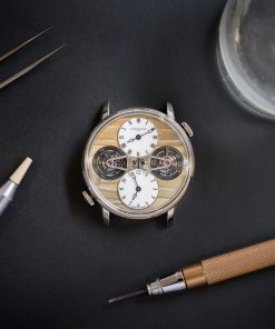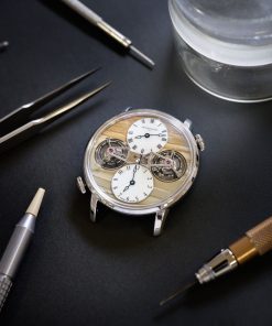 Born from a rare collaboration between Arnold & Son and Chronopassion, the Double Tourbillon ‘Landscape’ is a dual-timepiece unlike any other. Two independent tourbillons float under mirror-polished gold bridges, while twin dials in white opal track separate time zones. Between them, a piece of landscape jasper—chosen for its desert-like striations—anchors the scene.