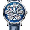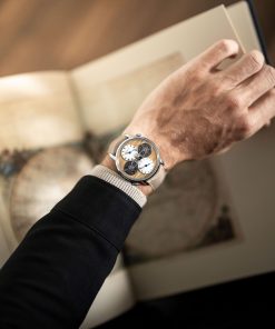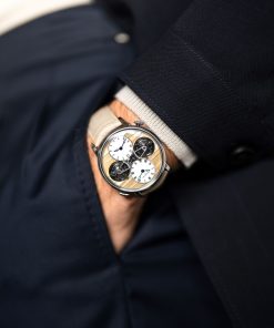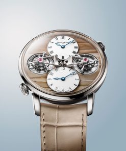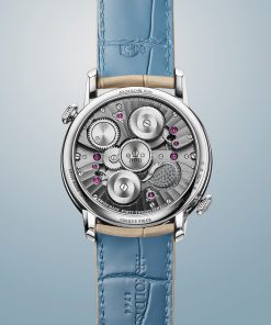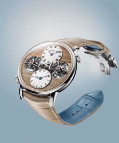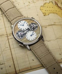 Encased in 43.5 mm of white gold, this sculptural watch is both mechanically complex and visually serene. The opal dials reflect symmetry and control; the beige alligator strap continues the soft, earthy palette. One crown sets local time (displayed at 12 o’clock in Roman numerals), the other adjusts the second time zone (shown at 6 in Arabic numerals)—each fully autonomous.