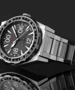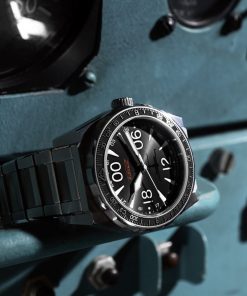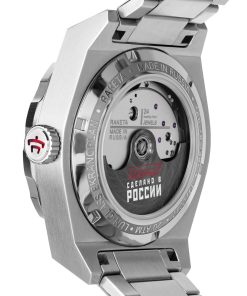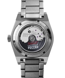 The Raketa “Ekranoplan” watch features a rotating bezel insert crafted from a segment of metal sourced directly from the Lun-class Ekranoplan, a token officially bestowed upon the Raketa Factory. On the watch’s reverse side, a finely adorned 24-hour automatic movement, entirely manufactured by the Raketa Watch Factory in Saint-Petersburg, is on display.
