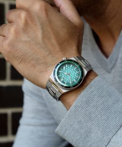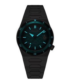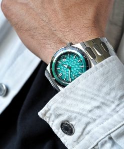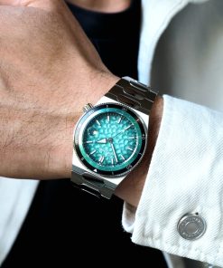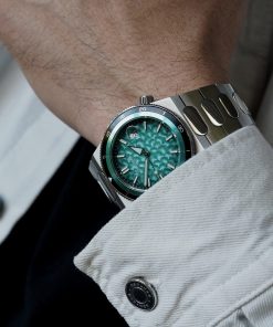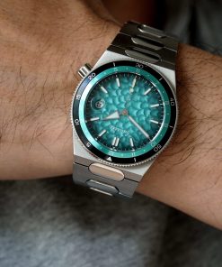 At its heart lies a dial that feels alive. Its layered construction recalls the ocean floor seen through a diver’s mask, textured and luminous, quietly drawing you in. The dual-scale bezel balances function and philosophy, one ring marking minutes, the other a distant time zone, a gentle reminder to breathe where you are and connect where it matters.