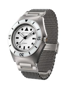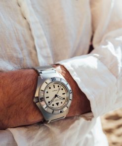 Indulge in the allure of shimmer and shine; after all, a touch of bling can elevate any ensemble. Christo, the founder of Bausele, is a passionate diver, who always found joy in merging his love for the depths of his daily life. This Endless Summer Ivory Pearl Dive Watch, with its entrancing pearlescent white hue, embodies this union exquisitely. Elegantly rugged, it’s thin enough to accompany you during those adrenaline-fueled adventures, yet sophisticated enough to add that touch of luxury to a suave outfit. The adaptability doesn’t end there; with interchangeable bracelets, you can easily transition from a professional setting to a casual night out.
