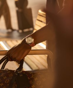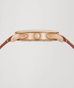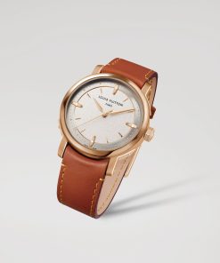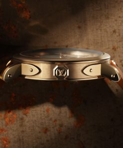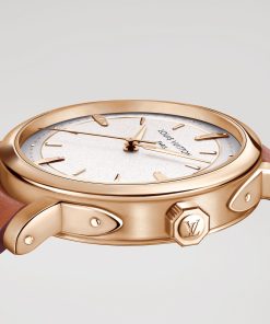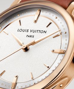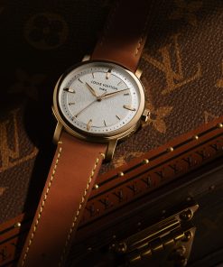 The rose gold models offer a refined, everyday elegance with textured dials, while the platinum models are set with precious stones, or feature a meteorite dial. These new designs emphasize Louis Vuitton’s heritage in trunk making, with elements like angled, riveted markers reminiscent of the brand’s iconic trunks. The redesigned dial includes gold studs and a brushed finish for enhanced readability.