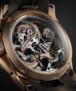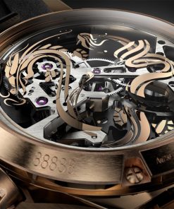 Roger Dubuis celebrates the Lunar New Year with the Excalibur Dragon Monotourbillon, a timepiece inspired by the Year of the Dragon, symbolizing strength and power. This watch is an artistic representation of the dragon, designed with exceptional creativity and technical innovation. It features a complex dragon design crafted from 27 pieces of brass, each piece intricately detailed, creating a 3D effect with volume and vitality.