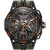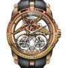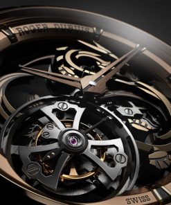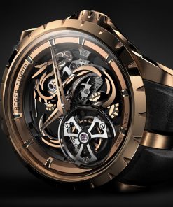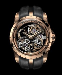 The watch’s design is complemented by the advanced Monotourbillon Calibre RD512SQ, a mechanism renowned for its complexity and a testament to Roger Dubuis’ horological expertise. This calibre is presented in a skeletonized form, showcasing the intricate workings and light, pure design. The watch is also notable for its use of non-magnetic materials like titanium and Cobalt Chrome, enhancing its resistance to magnetic fields and optimizing its power reserve.