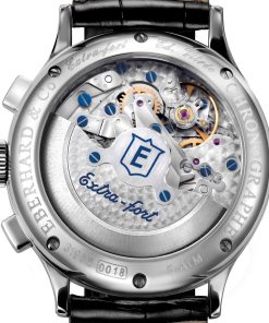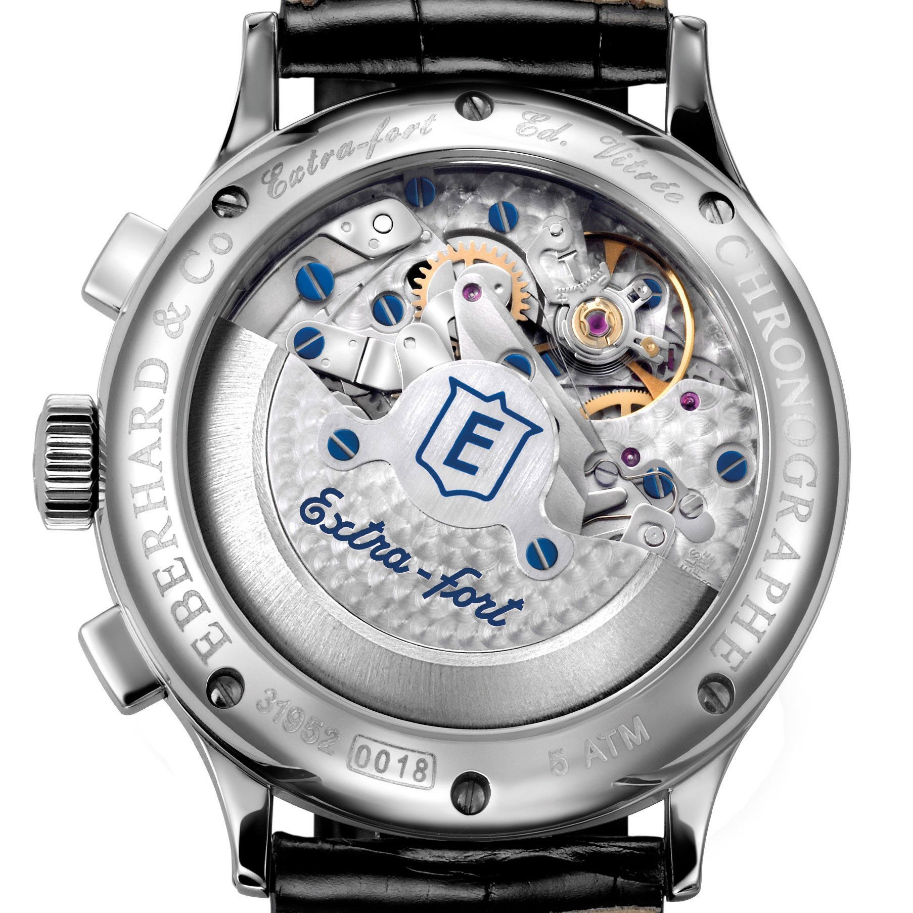 A sapphire glass caseback offers a glimpse into the craftsmanship behind the watch, highlighting an oscillating mass with a pearl finish, adorned with an exclusive coiffe that contains the rotor’s bearing, secured by two blue screws. This component is further personalized with the Maison’s emblem, showcasing the Shield and the “E,” symbolizing Eberhard & Co.’s commitment to elegance and quality in their watchmaking tradition.