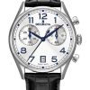 The 42mm stainless steel case is both durable and sleek, with tapered horns that add a touch of elegance. A scratch-resistant sapphire crystal protects the dial, which features a sunray-brushed finish, snailed minute and seconds counters, and applied Arabic numerals paired with leaf-shaped hands—combining vintage charm with modern style.