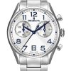 The 42mm stainless steel case is both durable and sleek, with tapered horns that add a touch of elegance. A scratch-resistant sapphire crystal protects the dial, which features a sunray-brushed finish, snailed minute and seconds counters, and applied Arabic numerals paired with leaf-shaped hands—combining vintage charm with modern style.