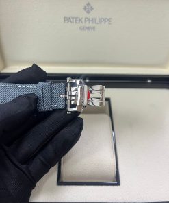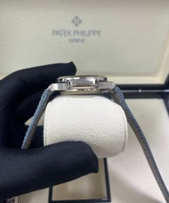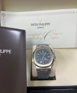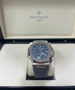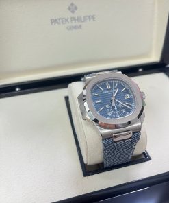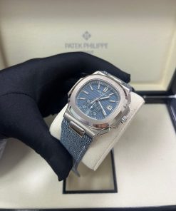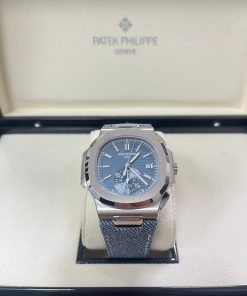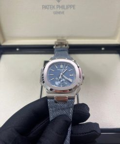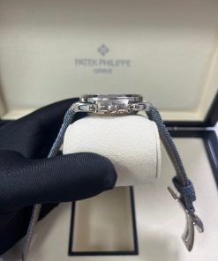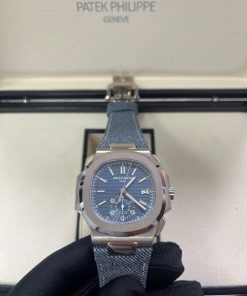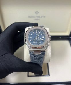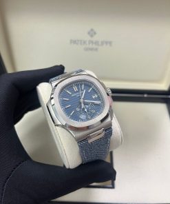 The Nautilus self-winding flyback chronograph comes in a new white gold version with an opaline blue-gray dial. This refined shade is echoed on the blue-gray denim-patterned calfskin strap with white gold Nautilus fold-over clasp. The watch is also delivered with an additional blue-gray composite material strap with fabric pattern.