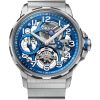 The case construction is both technical and architectural. A dual-layered design ensures strength and lightness, with an internal carbon composite shell protecting the movement and six external titanium components providing structural reinforcement. The openworked case middle widens toward the Angelus-branded crown, while a 12-notched bezel frames the sapphire crystal. An interchangeable bracelet system allows for versatility, offering a choice between a titanium bracelet, a matte blue alligator leather strap, and a sporty blue rubber strap.