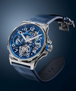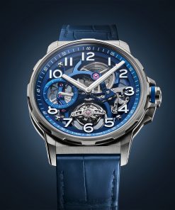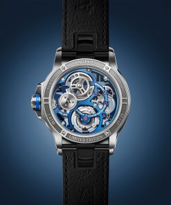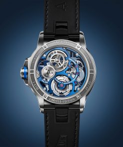 Angelus pushes the boundaries of contemporary watchmaking with the Flying Tourbillon Titanium, Blue Edition, a striking fusion of openworked precision and bold design. This new edition is encased in a lightweight carbon composite container and reinforced by a sculpted titanium middle with a notched bezel. At its heart, the hand-wound A-310 calibre powers a mesmerizing flying tourbillon at 6 o’clock, while large Arabic numerals appear to float between the sapphire crystal and PVD-treated bridges, enhancing the watch’s sense of depth and dynamism.
