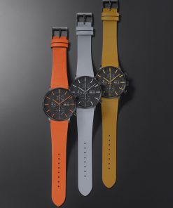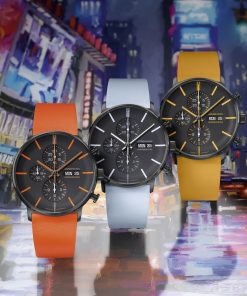 The matte black dial, complemented by gunmetal hands and chronograph subdials, creates an exciting visual contrast. Thoughtful placement of day and date displays maintains the symmetrical dial design. To ensure readability in any situation, the hour markers and hands are highlighted with accents in vibrant orange, subtle grey, and a lively curry hue, all coated with a luminous material for visibility in the city’s hustle and bustle, whether it’s day or night.