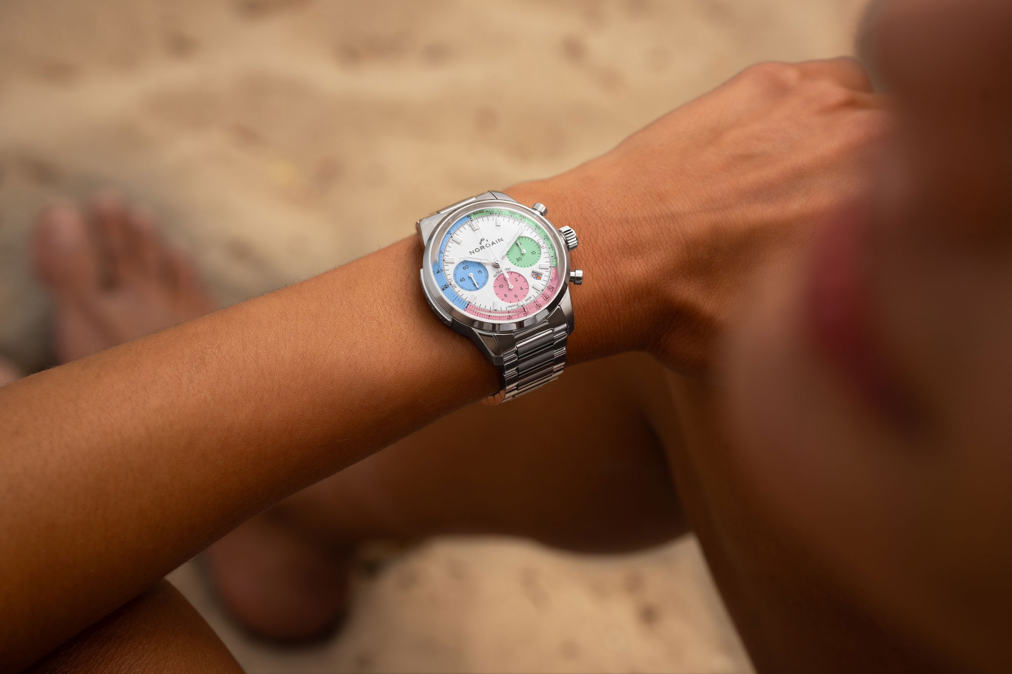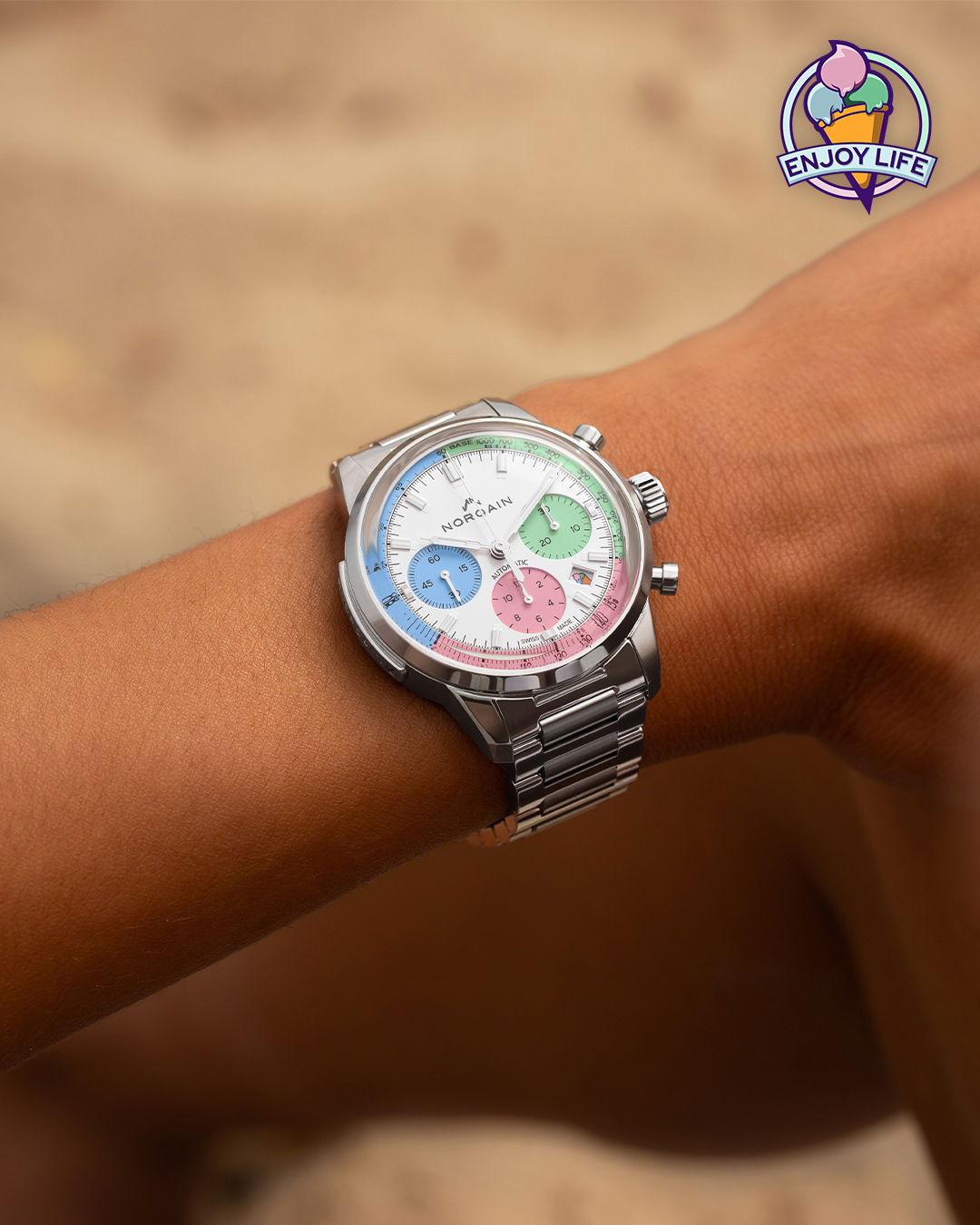 NORQAIN’s Freedom 60 Chrono 40mm “Enjoy Life” Special Edition brings a bold splash of summer to the wrist, with vibrant colours and playful details inspired by gelato. This unique timepiece celebrates the lighter side of life, from its cheerful green, pink, and blue chronograph subdials to the joyful illustrations of a triple-scoop ice cream cone that appear on the date display every week. More than just a nod to summer fun, these details serve as reminders to savour simple pleasures and embrace the spontaneity of the season. The message engraved on the caseback, “Enjoy Life,” perfectly encapsulates the spirit of the watch.