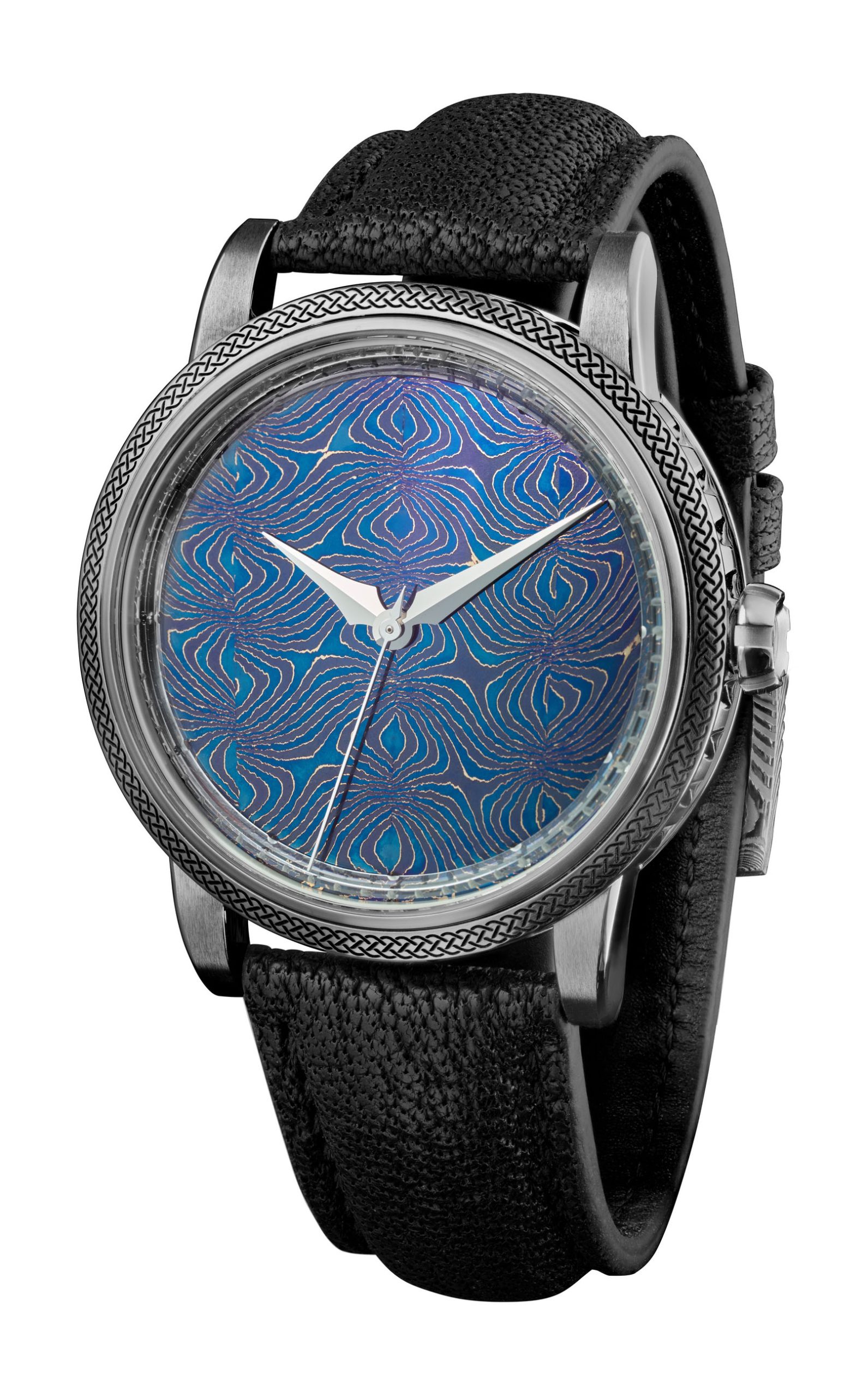 The 41.5mm stainless steel case draws on Viking motifs, with a braided bezel inlaid with enamel and deep grooves along the flanks, adding tactile nuance. A sapphire ring encircles the dial, clear by day and glowing orange at night thanks to GoS’s proprietary 3D Lumicast® technology, a subtle but powerful nod to the heat of the forge. Eschewing applied markers, time is tracked by 12 gaps in the sapphire, keeping the dial open and architectural. GoS’s signature spear-shaped hands and a fine seconds hand complete the composition with a sense of quiet purpose.