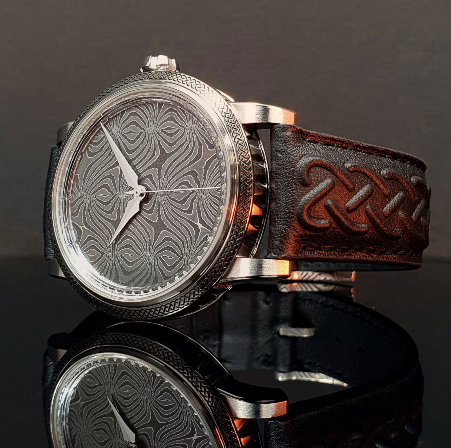 The Fullerö Sword from GoS Watches is a timepiece steeped in Scandinavian heritage, inspired by a remarkably preserved Viking sword unearthed in 1969 near Uppsala. Its Damascus steel dial, hand-forged by Swedish bladesmith Conny Persson, mirrors the ancient pattern-welded core of the original blade. Persson adapts centuries-old forging methods, adding a modern twist with 17-layer rods and fine nickel accents, to make the three dial variations: glowing steel, raw steel, or midnight blue. The result is a rich, organic surface that feels both ancient and undeniably contemporary.