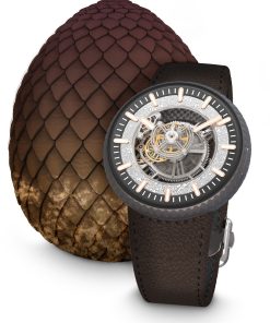Each set comes with a unique dragon egg sculpture made by the French workshop Leblon Delienne. Each resin egg, airbrushed to achieve a unique finish, serves as a nest for the watch and draws inspiration from the appearance of its corresponding dragon. The attention to detail extends to the egg’s design, featuring elements inspired by Dragonstone Castle, the ancestral seat of House Targaryen.