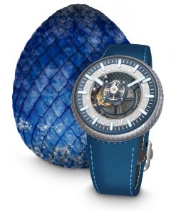 Each set comes with a unique dragon egg sculpture made by the French workshop Leblon Delienne. Each resin egg, airbrushed to achieve a unique finish, serves as a nest for the watch and draws inspiration from the appearance of its corresponding dragon. The attention to detail extends to the egg’s design, featuring elements inspired by Dragonstone Castle, the ancestral seat of House Targaryen.