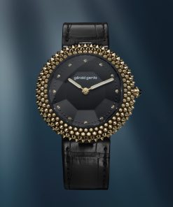 The latest collection from the revived watchmaking icon Gérald Genta introduces three evocative watches inspired by the 1994 Oursin. The Oursin, originally sketched by Gérald Genta after a family vacation in Corsica, features a unique aesthetic with a round case and deeply convex sides studded with beads. The 2024 Oursin models reinterpret Genta’s vision for a contemporary audience, maintaining the complexity, audacity, and distinctiveness of the original design. Each model has a convex titanium case studded with 223 beads, available in white gold, rose gold and diamonds, or yellow gold.