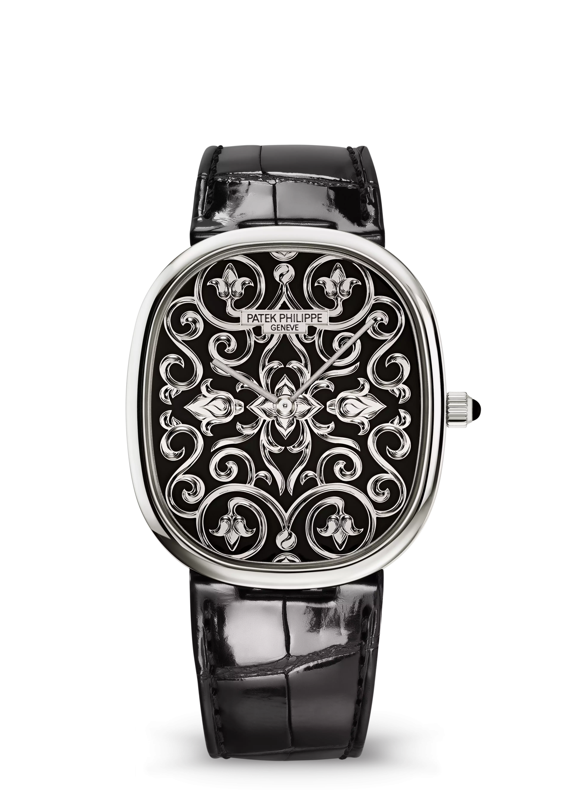 The timeless design of the Golden Ellipse is associated with the refined touch of Rare Handcrafts in a timepiece with a highly original face. The 18K gold dial plate is first hollowed out to form the cavities destined to receive the black Grand Feu enamel (champlevé enamel). The gold areas left in relief are then hand-engraved with plant-life and floral motifs.