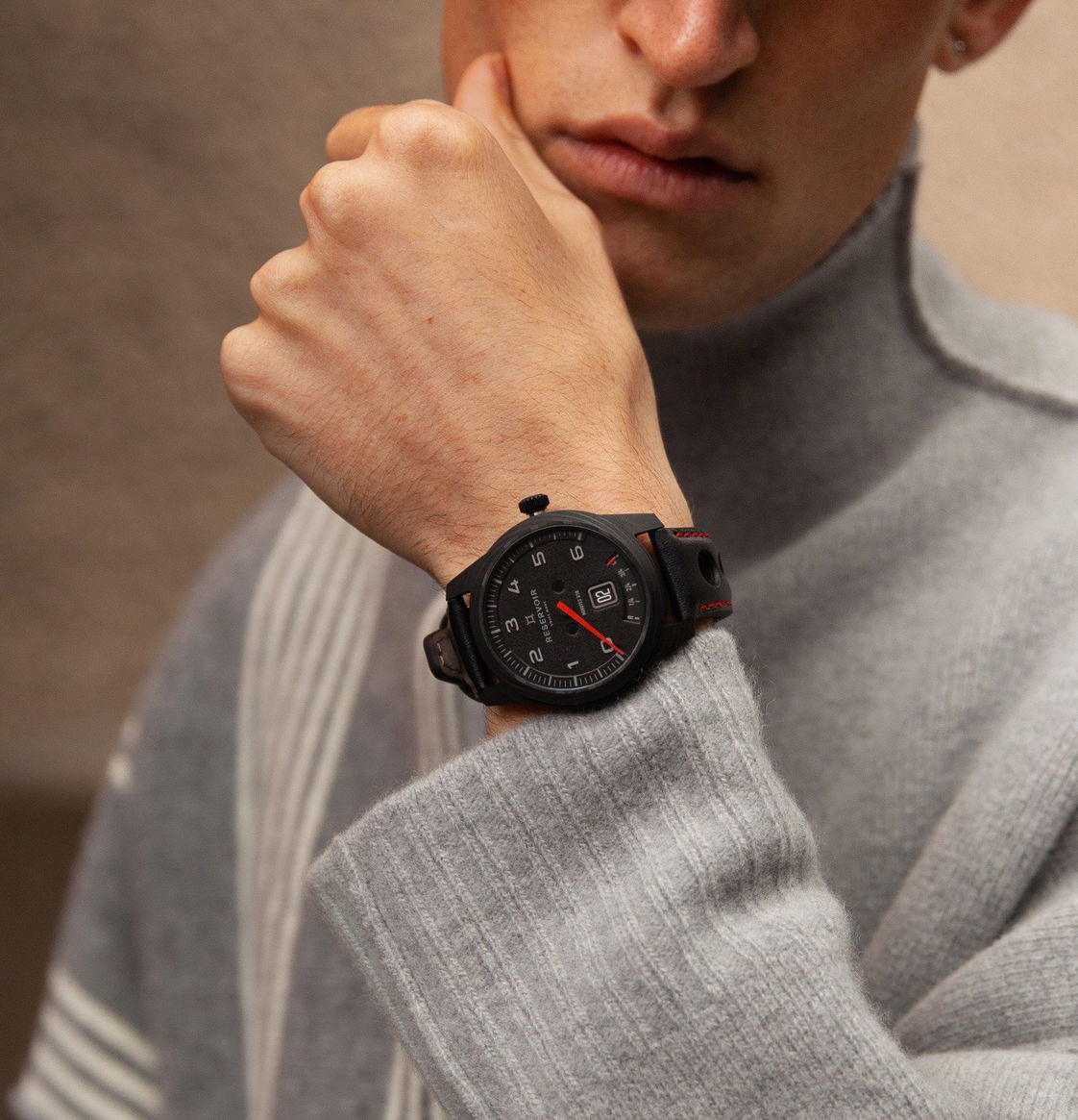 The GT Tour collection embraces the aesthetics of the classic car races. Adorned with a black leather strap reminiscent of automobile leather, this timepiece pays homage to the glorious era of car racing. The Carbon edition takes things even further with its carbon case and a dial featuring a sandblast finish, reminiscent of the surface of legendary race car tracks.