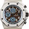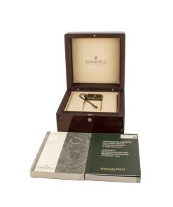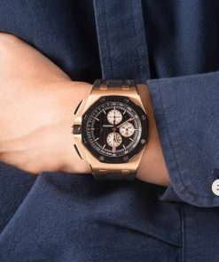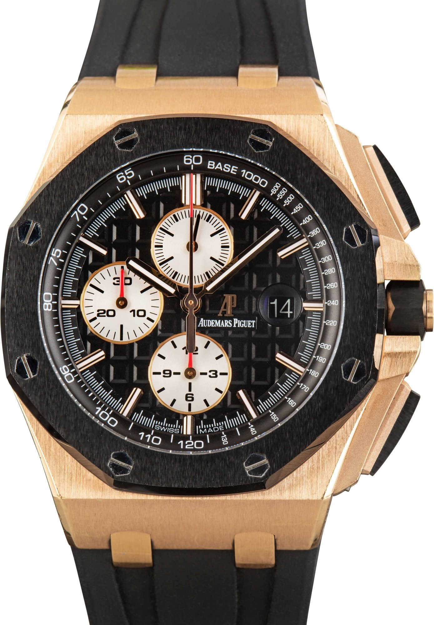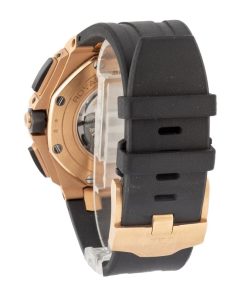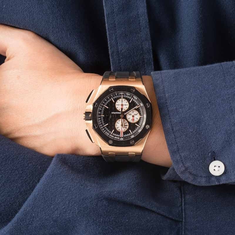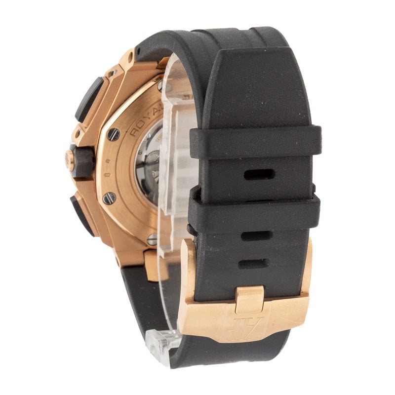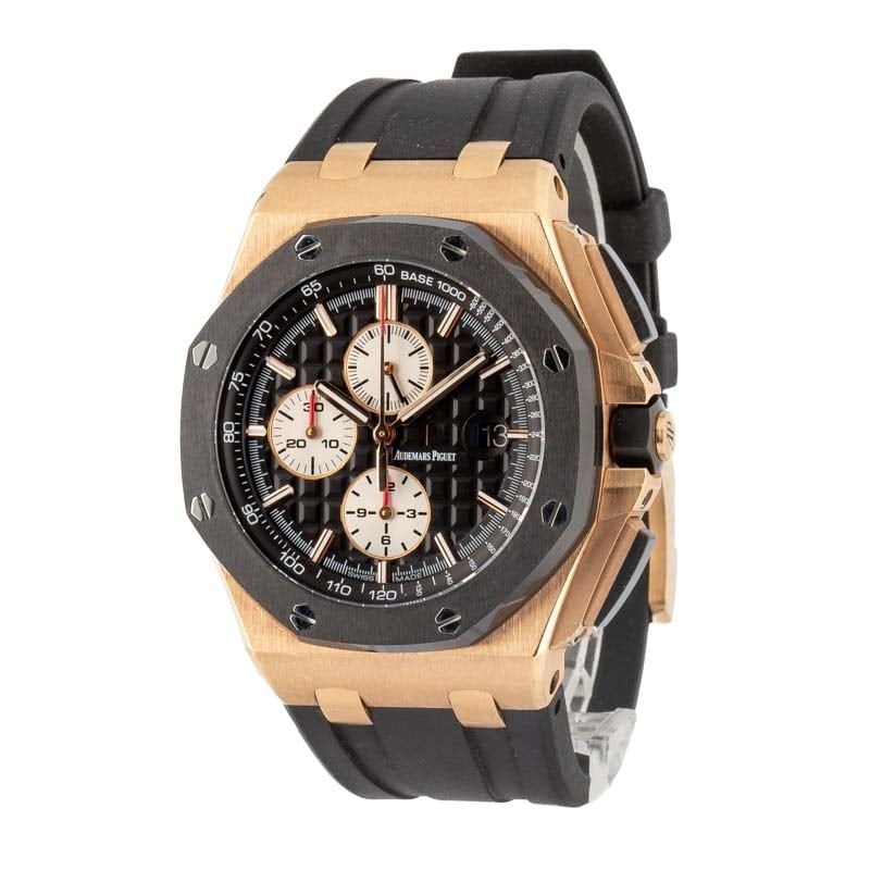 Audemars Piguet Royal Oak Offshore Chronograph ref. 26400RO.OO.A002CA.01 (2012) features a 44mm 18k rose gold case paired with a black ceramic bezel, exuding a bold and sporty presence. The black “Méga Tapisserie” dial includes chronograph subdials, date display, and luminous hands for excellent legibility. An exhibition caseback showcases the intricate automatic movement, while the integrated rubber strap with AP folding clasp ensures comfort and security. A standout Royal Oak Offshore, combining luxury, technical mastery, and unmistakable style.