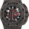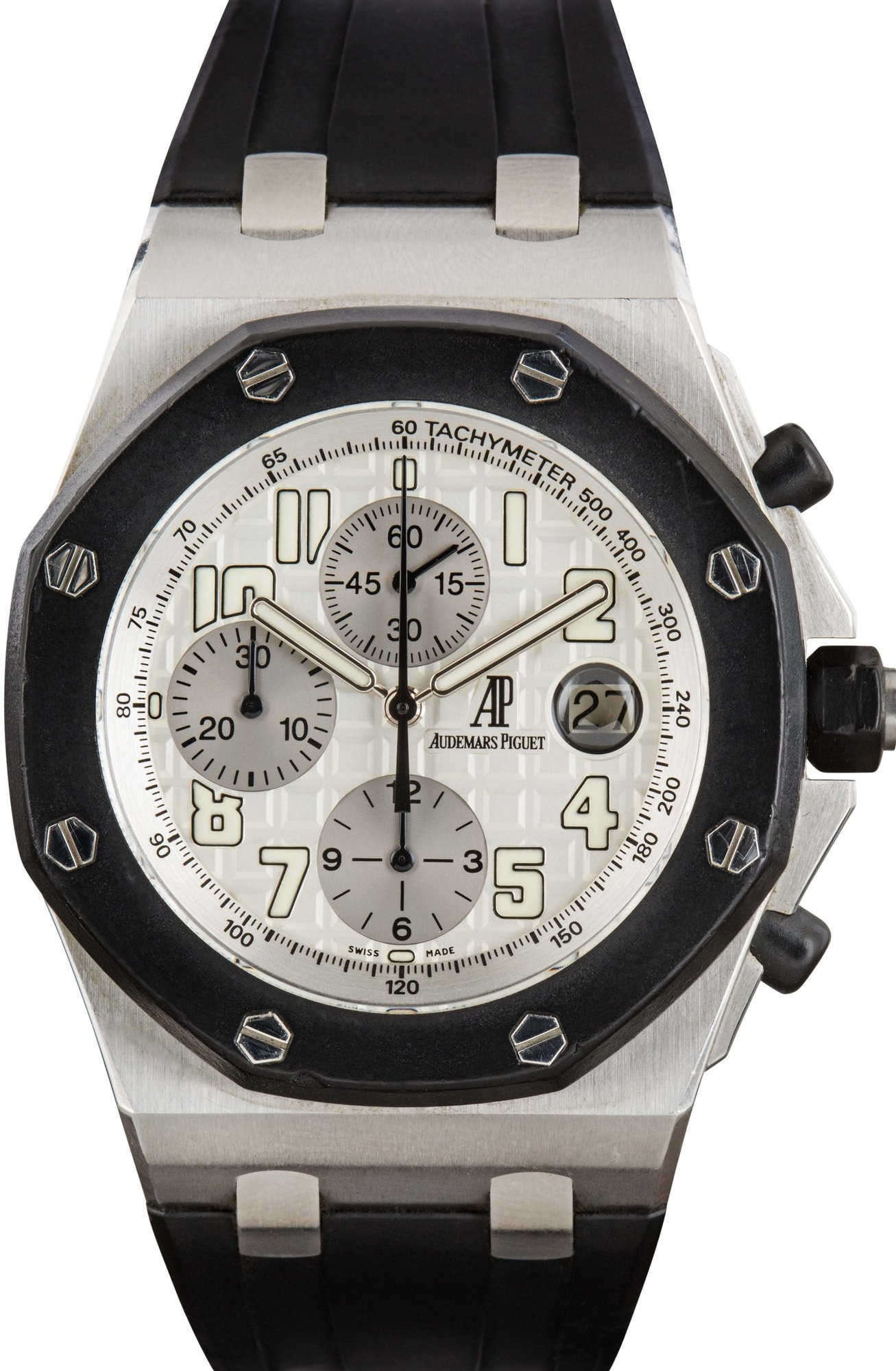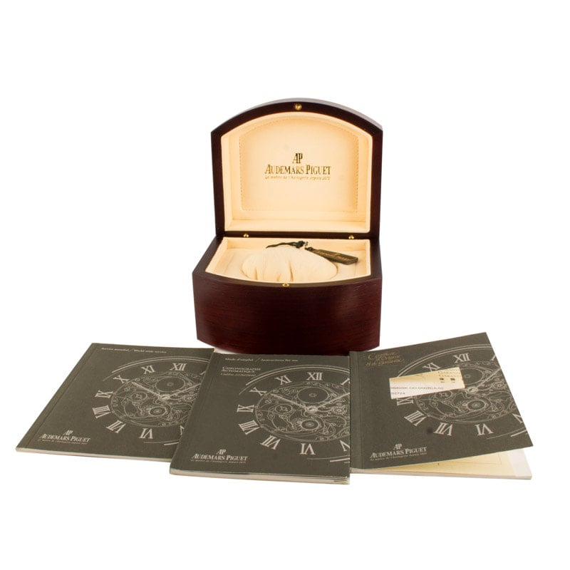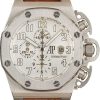 Commanding and unapologetically bold, this Audemars Piguet Royal Oak Offshore Chronograph ref. 25940SK.OO.D002CA.02.A (2004) fuses high-performance mechanics with an effortlessly edgy aesthetic. The 42mm stainless steel case and black rubber-clad bezel frame a striking silver dial with the signature Méga Tapisserie texture, bold Arabic numerals, and triple-register chronograph layout. Paired with a black rubber strap and rugged pushers, this Royal Oak Offshore is built for those who embrace impact, precision, and presence in every moment.
