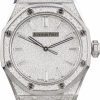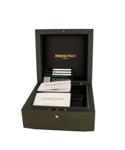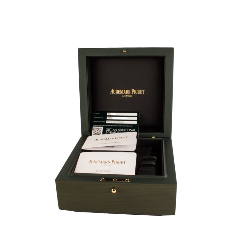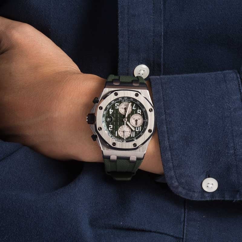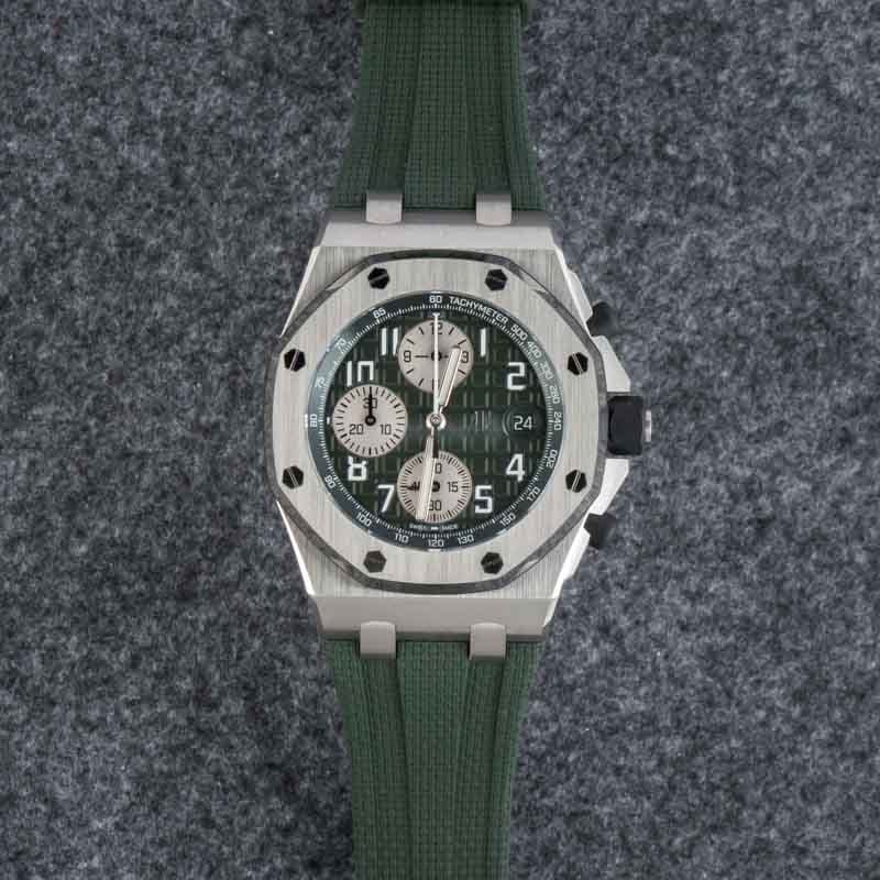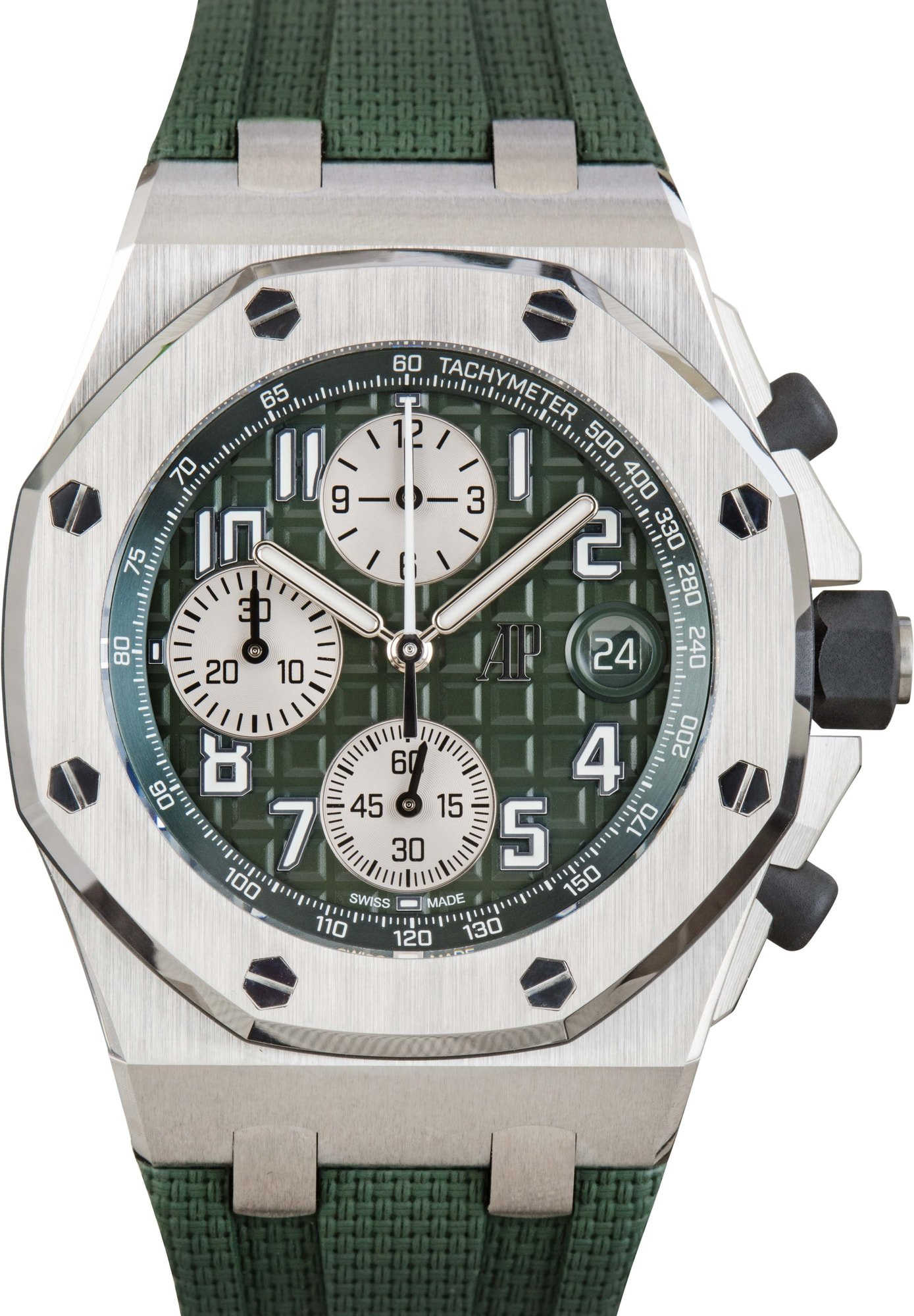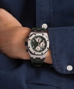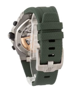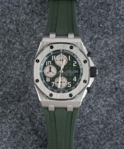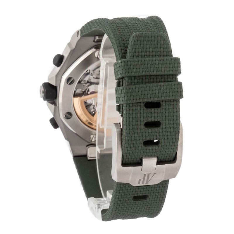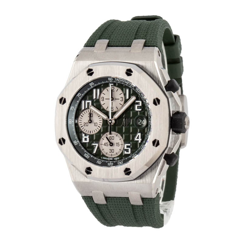 Audemars Piguet Royal Oak Offshore Self-Winding Chronograph ref. 26238TI.OO.A056CA.01 features a 42mm titanium case with a glareproofed sapphire crystal and titanium bezel. The khaki green “Méga Tapisserie” dial showcases silver-toned chronograph counters, Arabic numeral hour markers, and white gold Royal Oak hands with luminescent coating. Powered by a self-winding movement, this sporty chronograph offers 100 meters of water resistance. It comes on a khaki green rubber strap with textile decoration and a titanium AP pin buckle.
